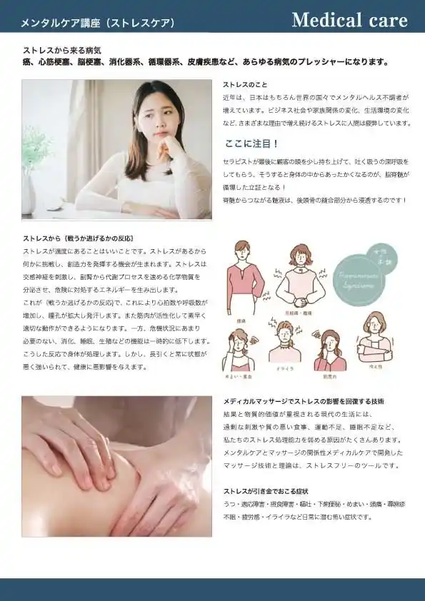 心と体の不調は、単なる疲れやストレスだけではなく、筋肉・神経・血流・メンタルの複合的な反応として現れます。本講座では、その仕組みを理解しながら、回復へ導くための技術を段階的に習得できます。 |