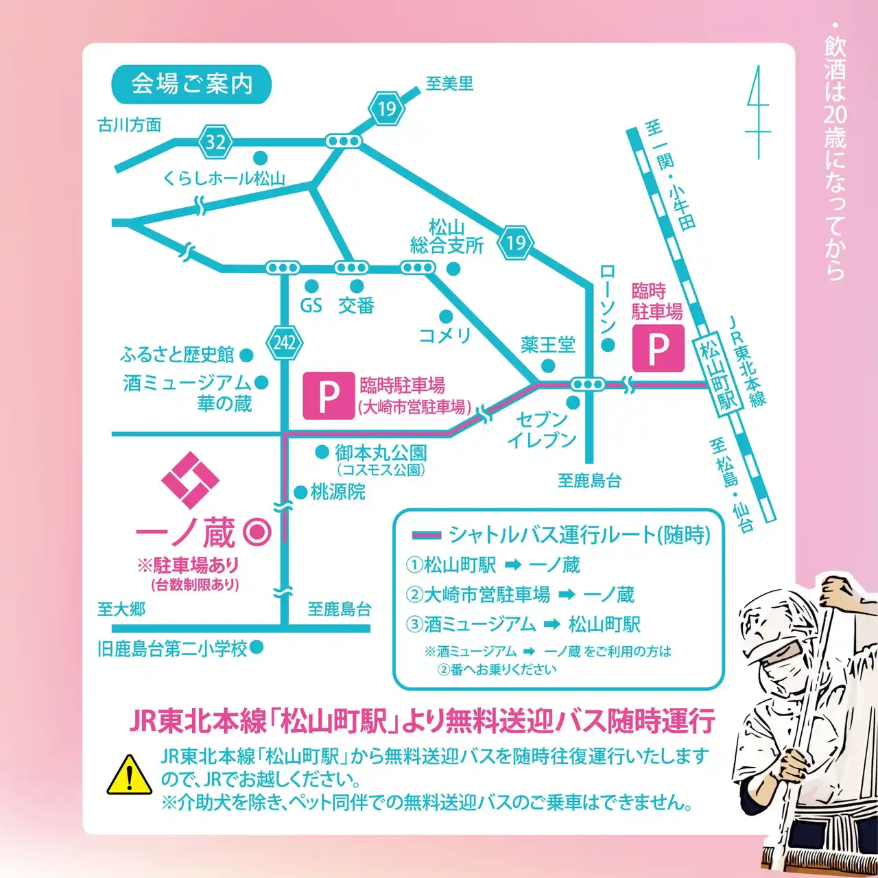 ※JR東北本線「松山町駅」から無料送迎バスを随時往復運行いたしますので、JRでお越しください。 |