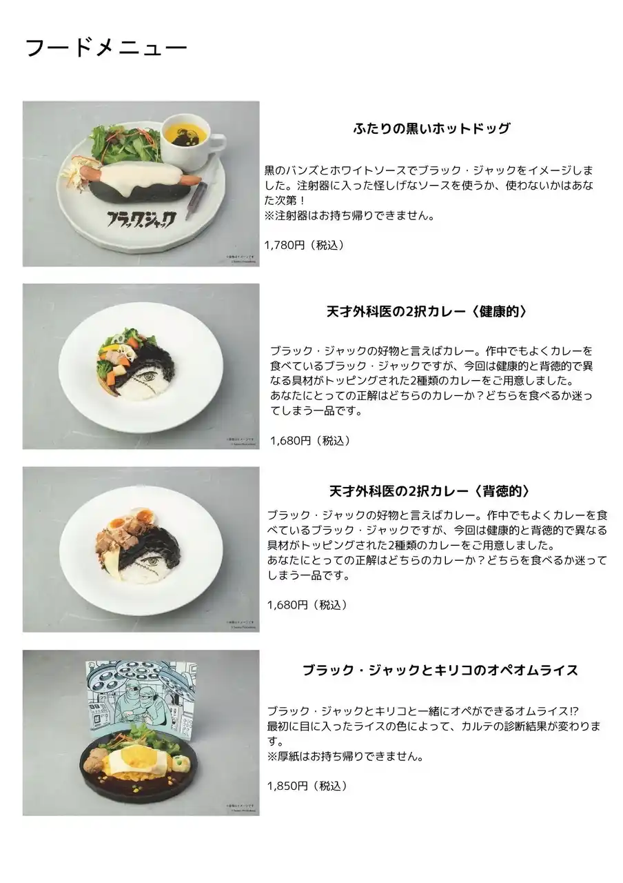 黒のバンズとホワイトソースでブラック・ジャックをイメージした「ふたりの黒いホットドッグ」は、お料理に付いてくる怪しげな注射器のソースを使うのか、使わないのか。「天才外科医の2択カレー」はブラック・ジャックの好物であるカレーを《健康的》と《背徳的》で異なる具材がトッピングされた2種類をご用意するなどメニューによって様々な選択が待ち受ける。