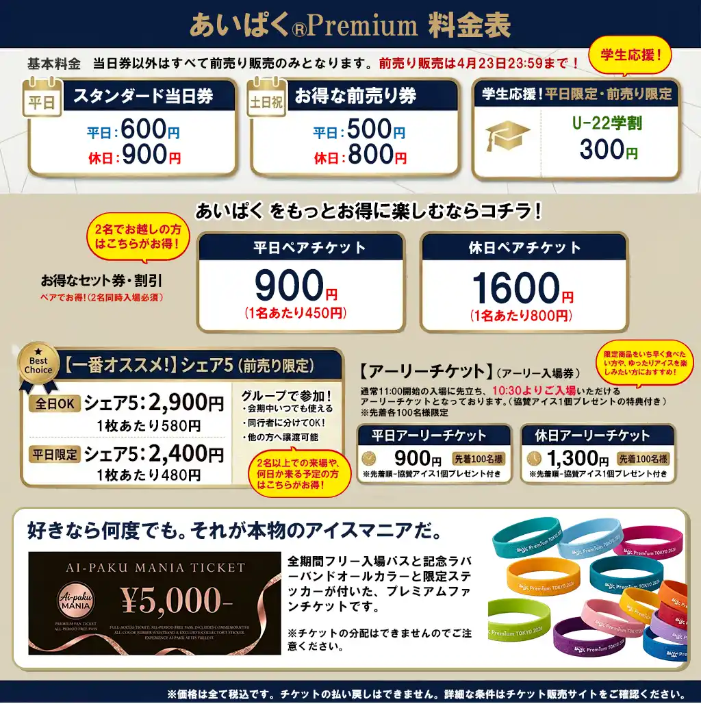 入場料は平日600円・休日900円(前売りあり)、ペアや学割・アーリー入場など目的に合わせたチケットも充実しており、全期間通い放題のあいぱく(R)MANIAチケットは5,000円をご用意しています。平日・休日によって料金を調整することで混雑の分散につなげ、より快適にお楽しみいただける環境づくりを目指します。全国の個性豊かなアイスを楽しめる場を今後も長く 続けていくための取り組みですので、何卒ご理解とご協力をお願いいたします。 |