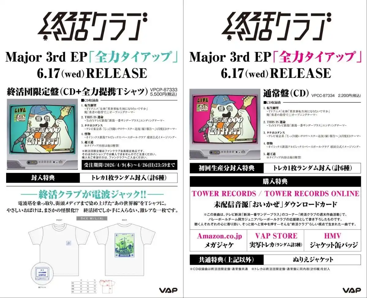 新潟在住の日本語ロックバンド、終活クラブが6/17(水)にMajor 3rd EP「全力タイアップ」を全国リリースすることを発表した。 |