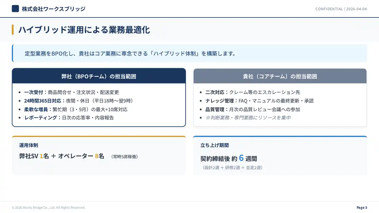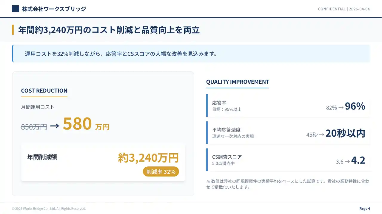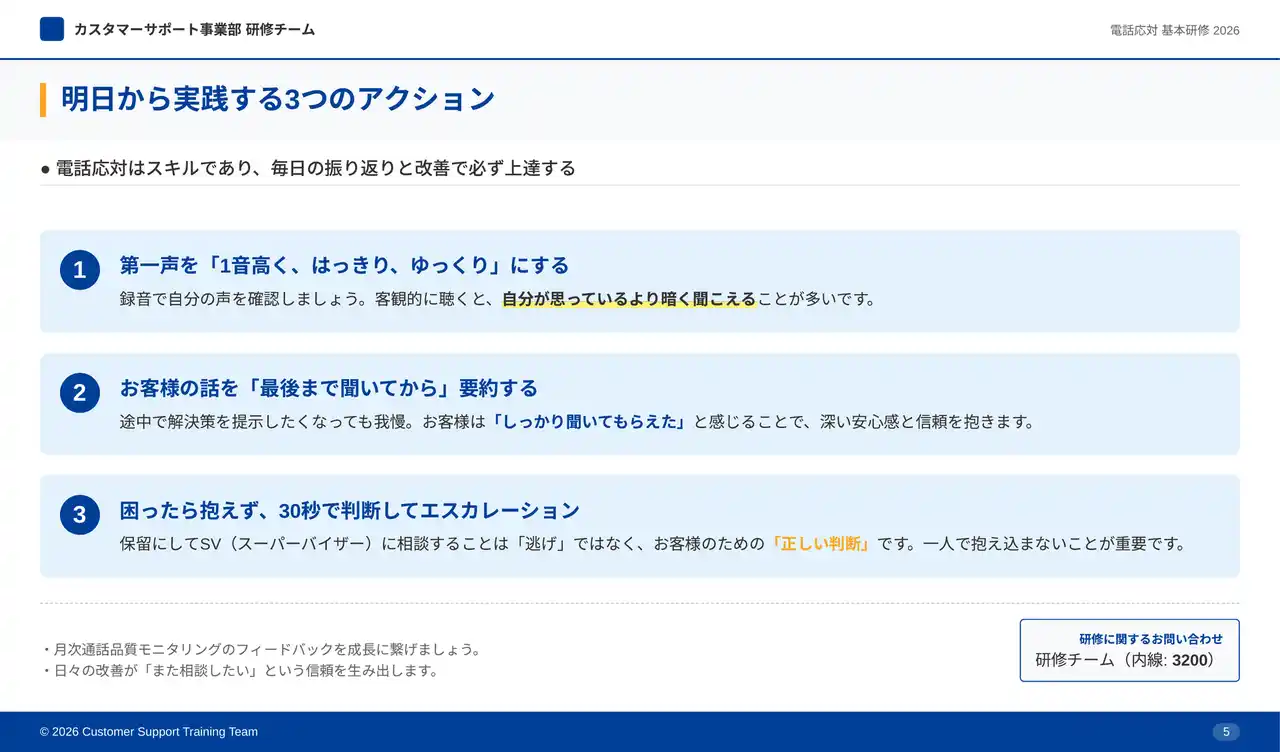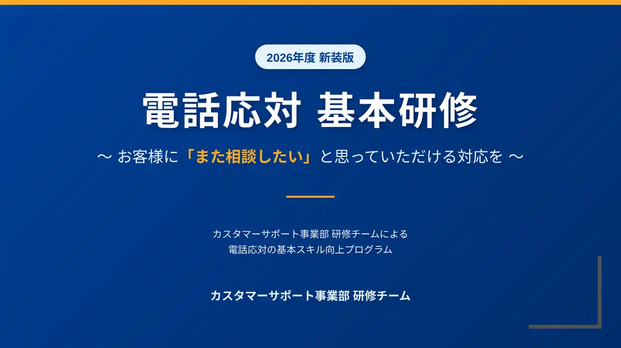 2つ目は「研修スライドのデザインリニューアルスライド」です。既存の堅いテキスト形式の研修教材を、視覚的で親しみやすいスライドへ変換できるサンプルです。既存研修テキストやPDFを素材として投入するだけで、コールセンターやBPO現場の受講者向けに視覚的でわかりやすいスライドへリニューアルすることが可能です。受講者の理解度や学習意欲を高めるとともに、研修担当者のリデザイン工数を大幅に削減できます。 |