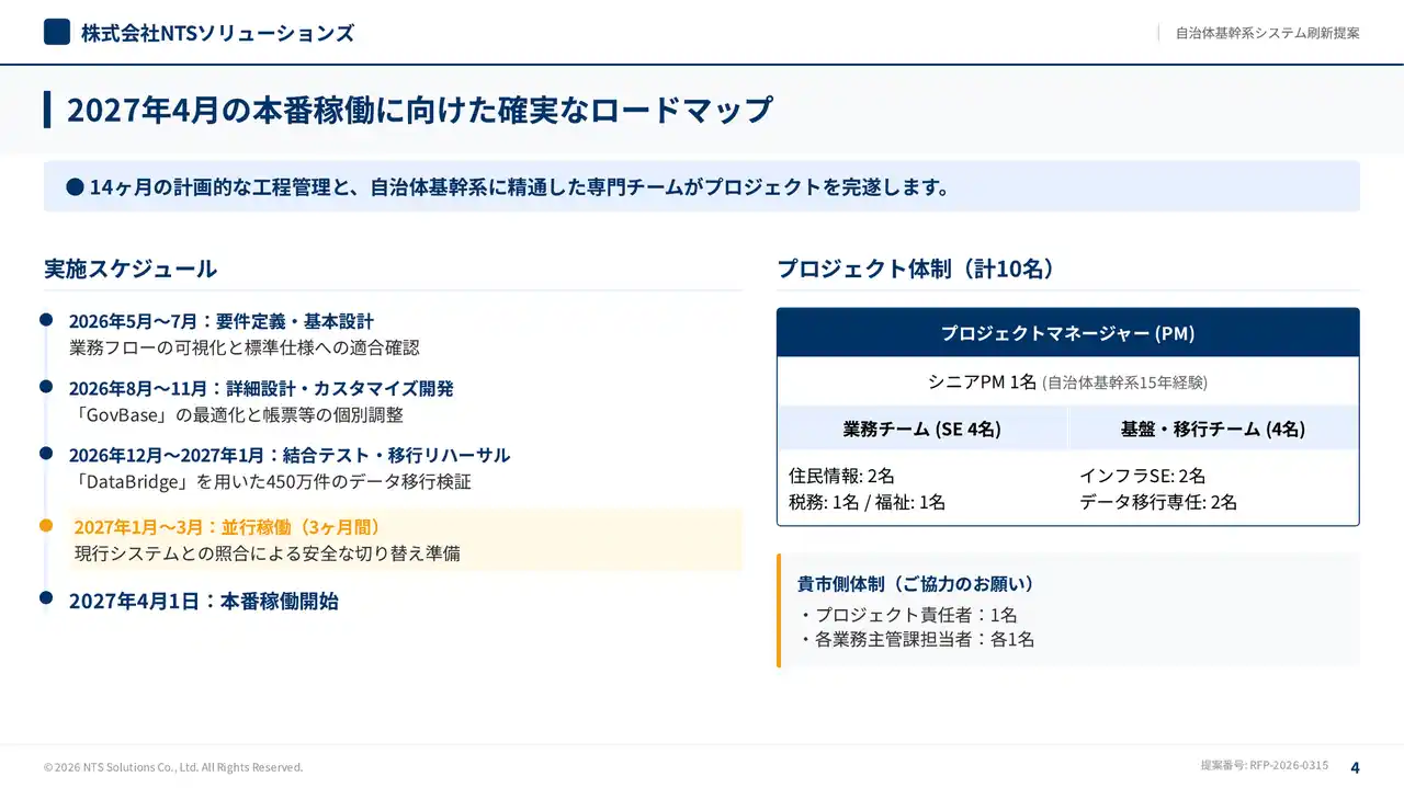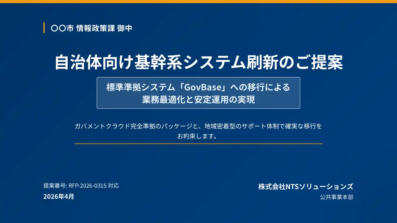 4つ目は「RFP対応の提案スライド」です。RFPに記載された要件項目に沿って構成した、入札・コンペ向けの提案スライドを生成できるサンプルです。複数案件のRFPが同時期に重なると、提案スライドの作成リソースが不足し、品質を維持しながら期限内に提出することが困難になるという課題に対応しており、RFP資料PDFや過去の提案書を素材として活用することで、要件への回答を網羅した提案スライドを迅速に制作することが可能です。提案体制の限界によって応札を見送るケースを減らし、受注機会の拡大につなげられます。 |