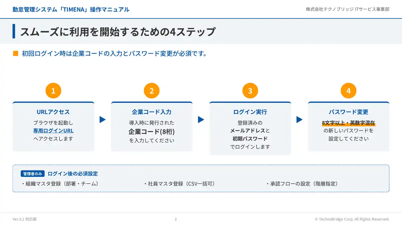 今回、このスライド生成機能にコンサル・BPO・SIer企業向けのサンプルスライドを新たに追加しました。サンプルスライドをテンプレートとして選択することで、用途に合ったデザイン・構成のスライドをすぐに作成開始することが可能です。たとえば、システム導入時のマニュアル説明資料を作成したい場合、該当するサンプルスライドを選び、Word形式のマニュアルをアップロードするだけで、要点が整理されたスライドが自動生成されます。専門的なデザインスキルがなくても、高品質なスライドや動画を制作できるため、提案・マニュアル・研修といった現場で発生する資料作成の負担を軽減します。 |