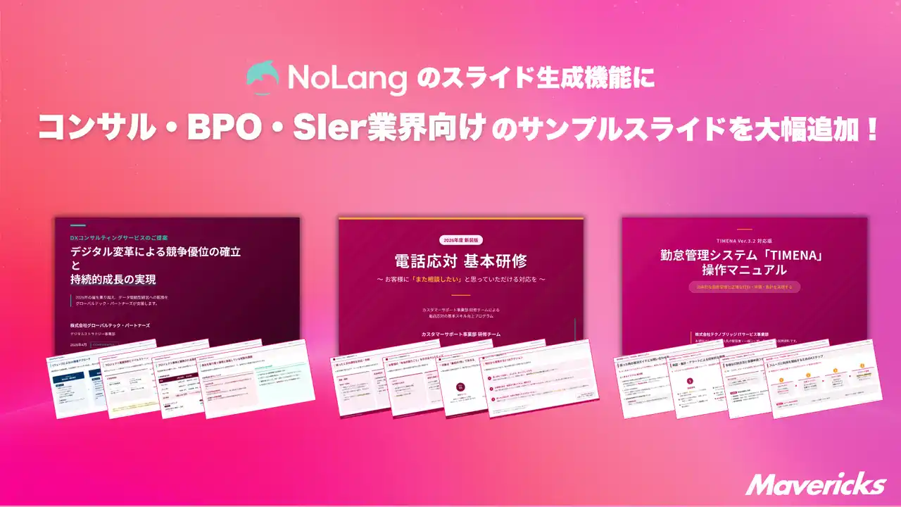 日本発、動画生成AI「NoLang(ノーラン)」を提供する株式会社Mavericks(本社:東京都文京区、代表者:Founder CEO 奥野 将太)は、この度、NoLangのスライド生成機能において、コンサルティングファーム・BPO事業者・SIer企業向けのサンプルスライドを新たに追加しました。クライアント提案資料やシステム導入時の操作マニュアル、研修教材のリデザインなど、現場で頻発する資料作成ニーズに対応した5種類のテンプレートを用意。WordやPDFの既存資料を素材として投入するだけで、要点が整理された高品質なスライドや動画を自動生成できるため、提案・マニュアル・研修資料の作成工数を大幅に削減し、コンサルタントが本来注力すべきクライアント対応や課題分析にリソースを振り向けられるようになります。 |