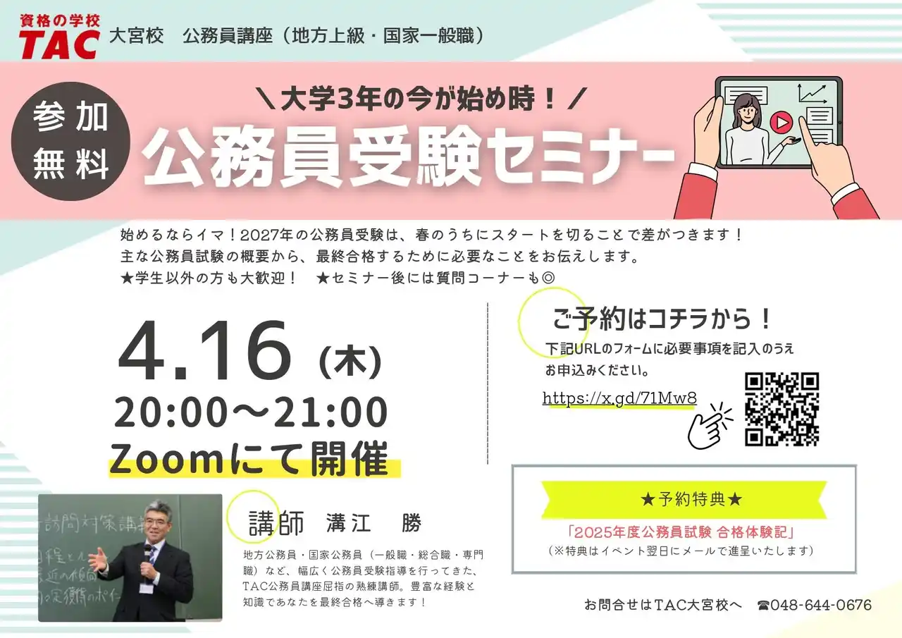 資格取得に向けた教育サービスを展開しているTAC株式会社(東京都千代田区)では、公務員試験を検討されている大学3年生へ向けて「大学3年生の今が始め時!公務員受験セミナー」を4/16(木)にオンラインで開催します。 |