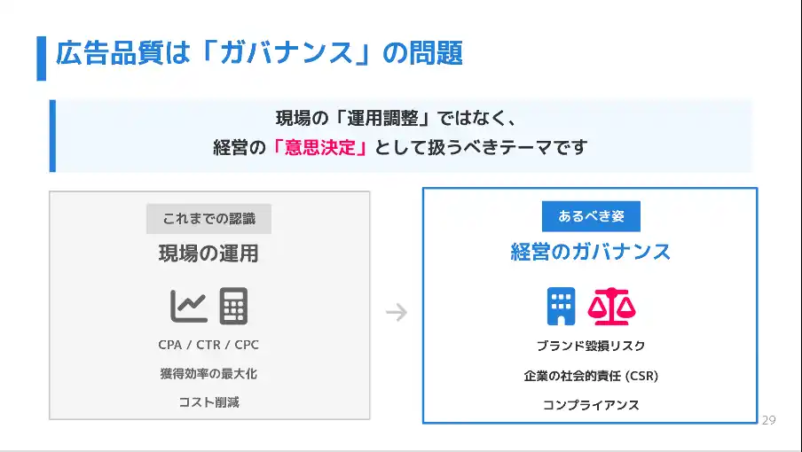 広告問題が消費者保護や民主主義への脅威といった社会問題に発展している背景から、2025年6月に「デジタル広告の適正かつ効果的な配信に向けた広告主等向けガイダンス」を発表しました。これに対応するための重要な枠組みが「JICDAQ(デジタル広告品質認証機構)」の認証です。細井はJICDAQ認証を「広告を扱うための免許証」と表現しました。2026年からは第三者認証が必須となり、現在では提案の参加資格や大手代理店からの運用委託の必須条件になるなど、ビジネス上の重要要件になりつつあることを強調しました。 |
