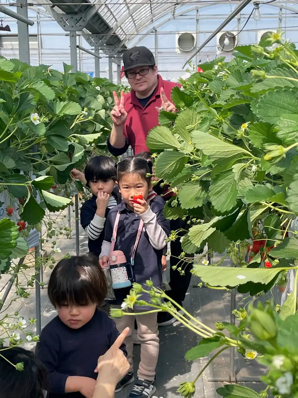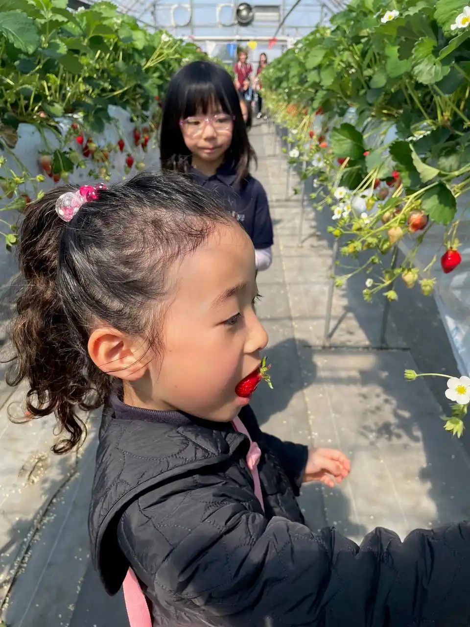 | 本農園では、水耕栽培によっていちごが育てられており、子どもたちはその仕組みにも興味を示していました。自分の手で収穫したいちごを味わい、友だちと分かち合いながら食べる体験は、「食」への関心を高める貴重な機会にもなります。「美味しいね!」「どうやって作っているのかな?」といった英語でのやり取りを通して、子どもたちは食べ物への興味や感謝の気持ちを自然と育んでいきました。 | |||||||||