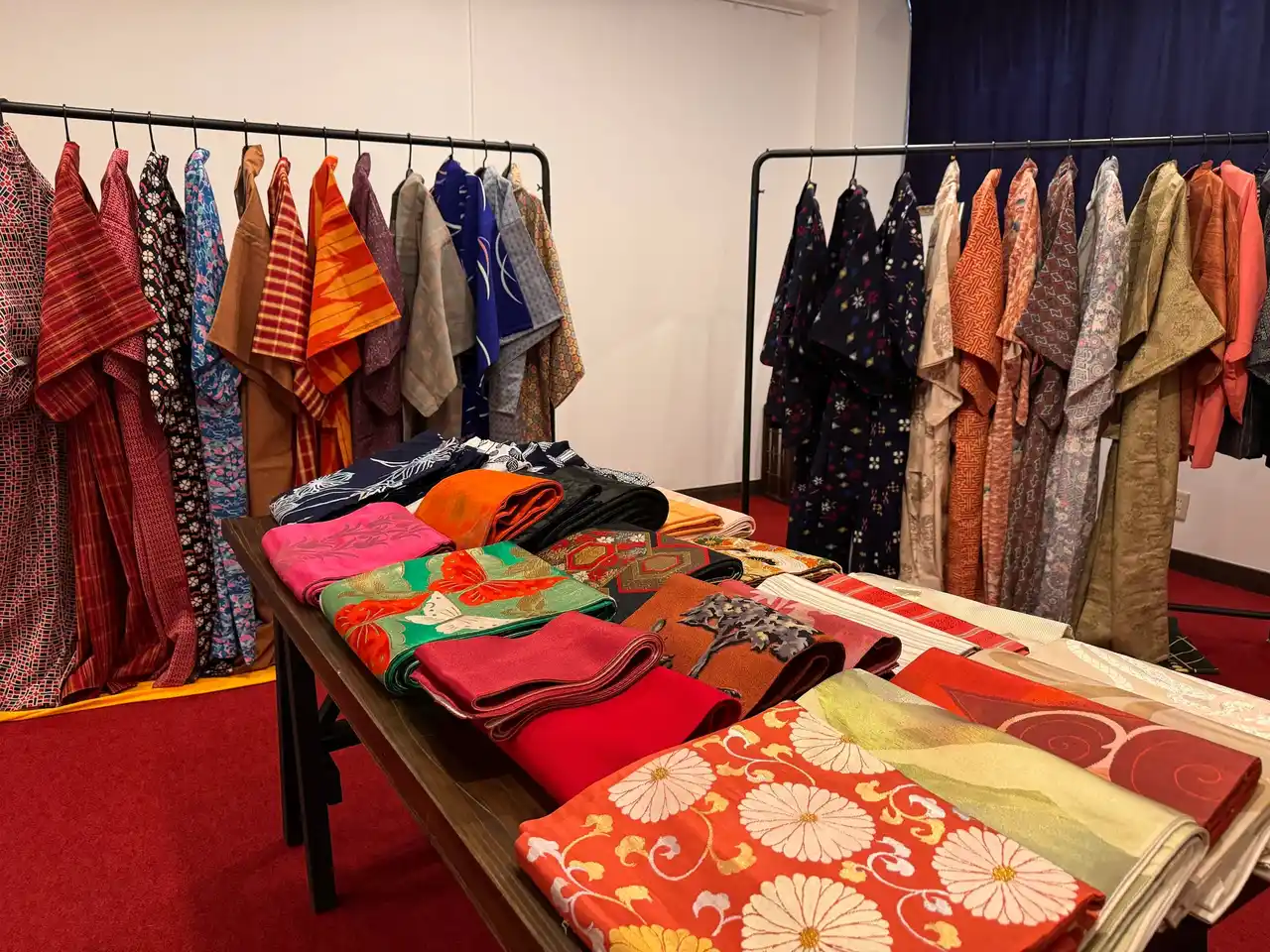 会場には130点以上の着物・帯・羽織が並びます。すべてスタッフがシミ・臭い・汚れを確認しており、安心して選ぶことができます。 |