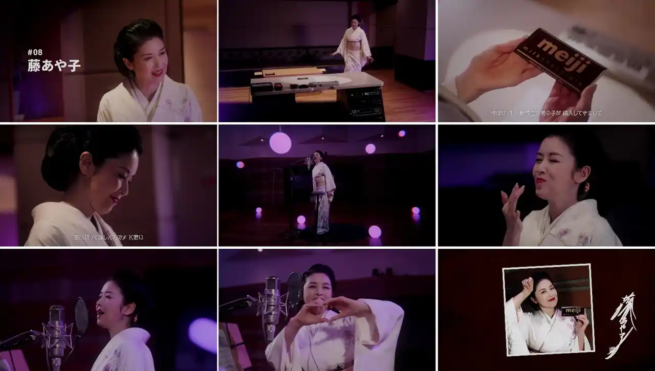 そして8番目を飾るのは、「明治ミルクチョコレート」が今年9月に100周年の「節目」を迎えるのと同じく、来月5月10日に65歳の「節目」を迎える藤あや子さんです。チョコレートとの相性を考えてご自身で選んだという優美な着物姿と、持ち前の艶のある歌声は必見です。さらに、9番目は、代表曲「なごり雪」発売から50年が経ち、今年活動55周年の「節目」を迎えるイルカさんの動画を公開予定です。それぞれ「明治ミルクチョコレート」とご縁のある方を起用しております。