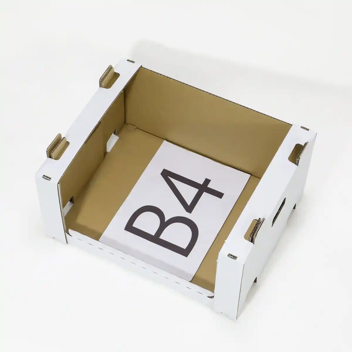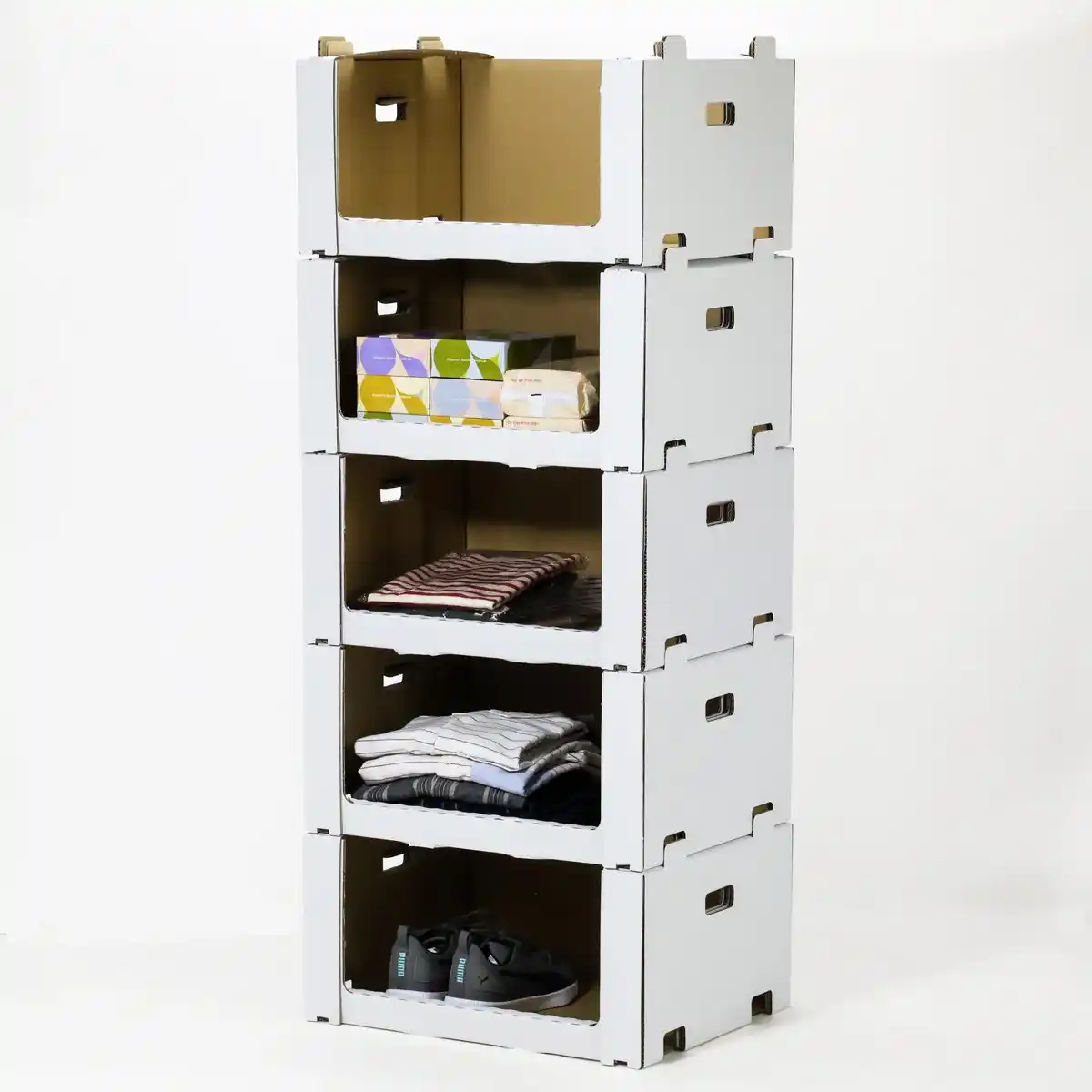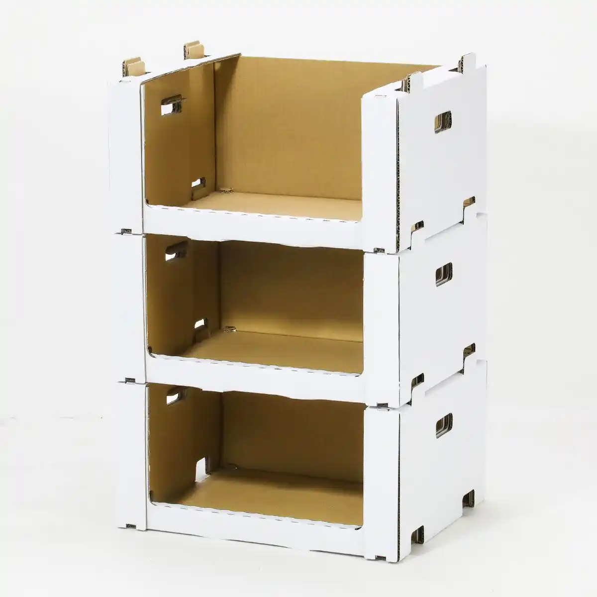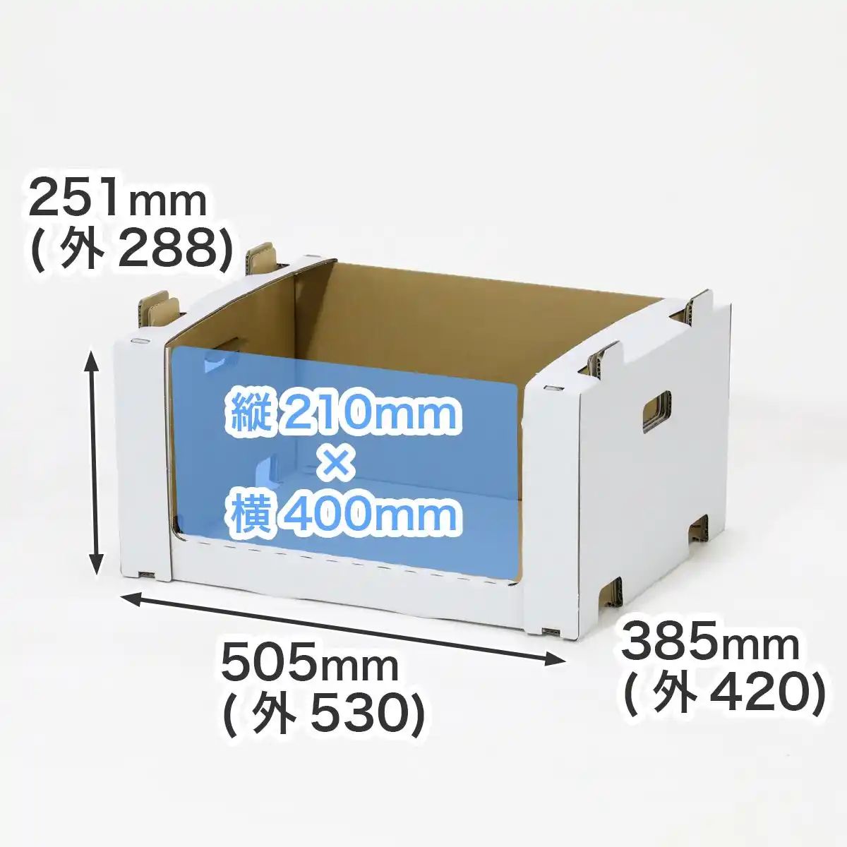 | 天面と底面に差し込み構造を設けており、積み重ねるだけで安定した棚としてご利用いただけます。物流倉庫やオフィスでのピッキング用の棚としても役立つダンボール製の収納ボックスです。 | |||||||||||