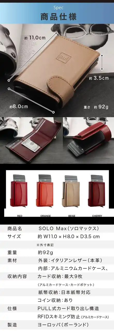 SOLOMaxは「必要なものを、必要な分だけ、最もスマートに持ち歩く」という思想のもと開発された高機能ミニ財布です。 |