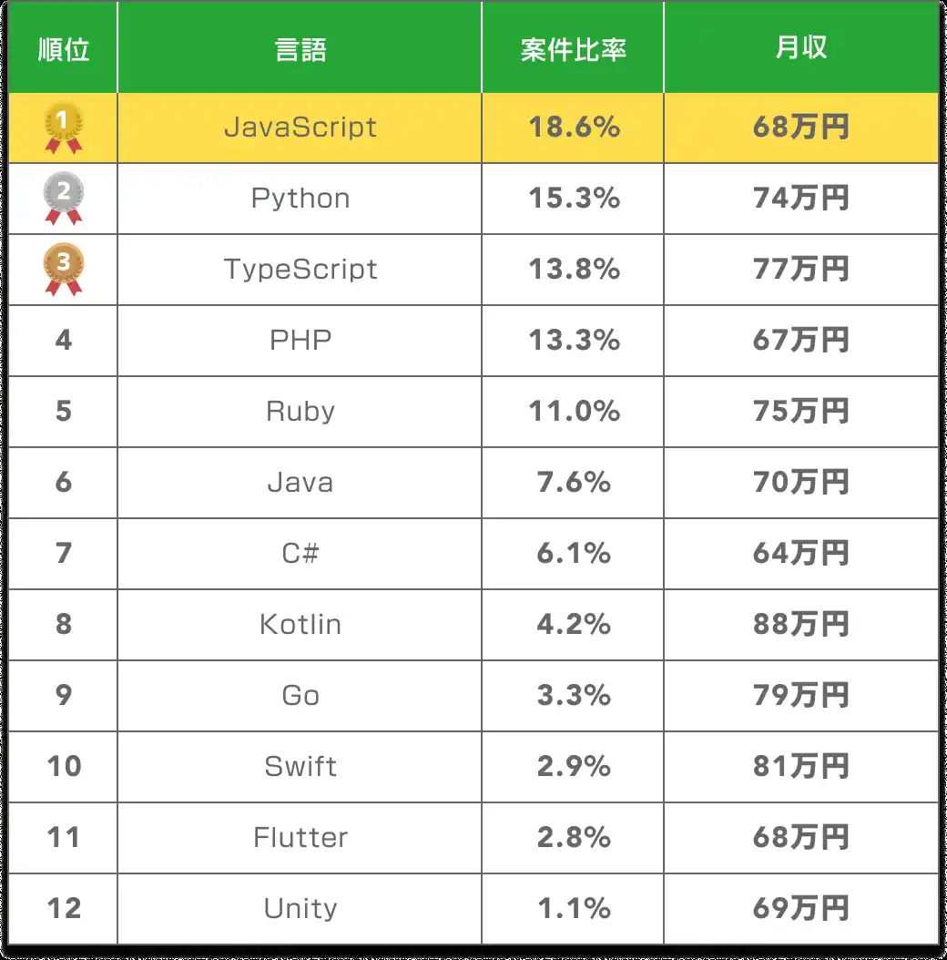 | 案件数の多さは競争の激しさでもありますが、スキルに応じた案件を見つけやすい環境が整っている言語といえます。 | |||||