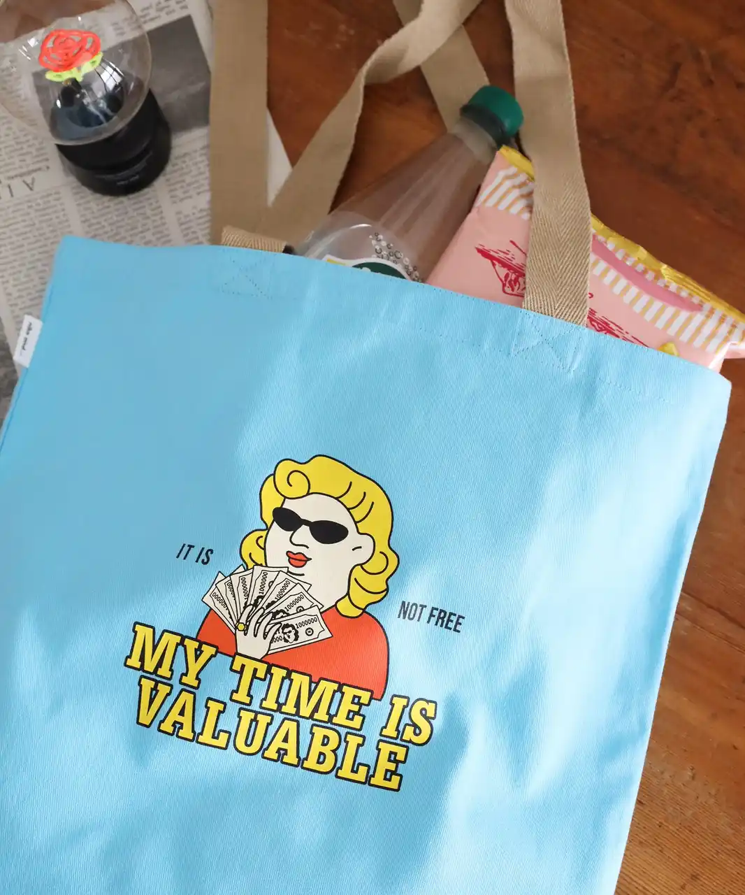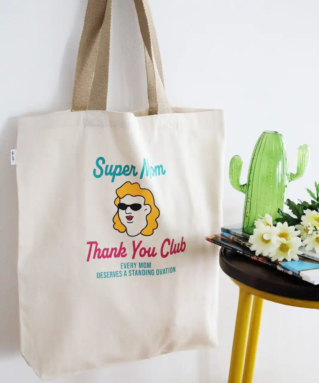 カラフルな色合いにSuper Momのデザインがインパクトのあるトートバッグ。 |