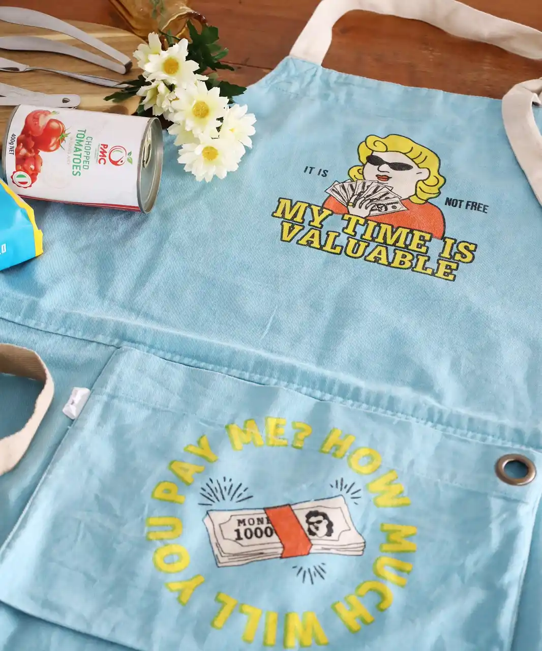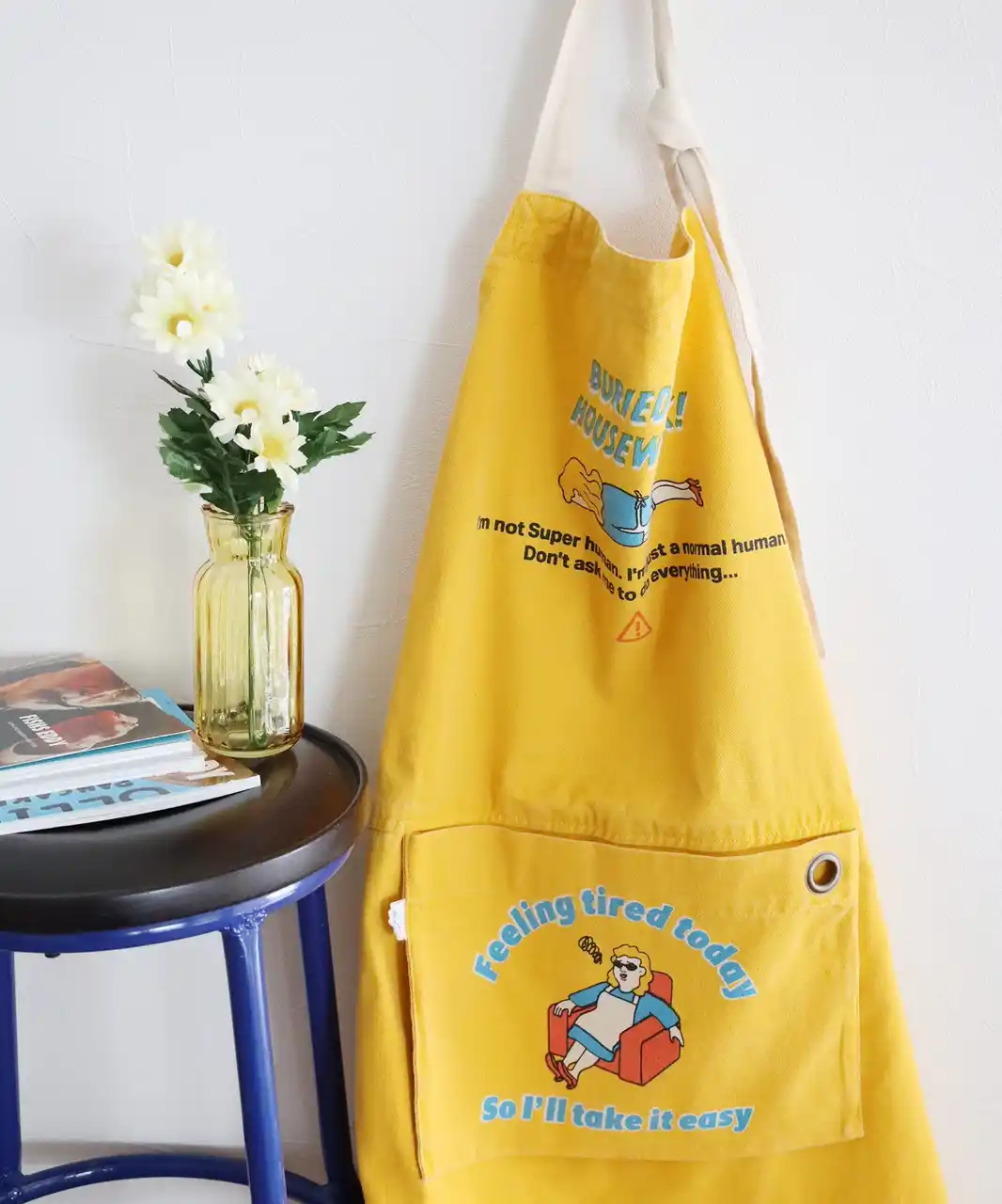 Super Momがデザインされたエプロンは、フロントの大きなポケットに畳んで入れられるパッカブル仕様で、使わないときはすっきり収納ができます。ポケットの裏側にはくすっと笑える一言が書かれていて遊び心があるのもポイント。 |
