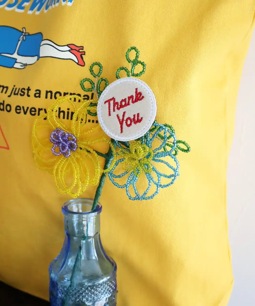 パッケージのまま飾っても花瓶に挿しても可愛いビーズフラワー。Thank youのメッセージはバッジになっているので、取り外してラッピングなどに使用しても◎ |
