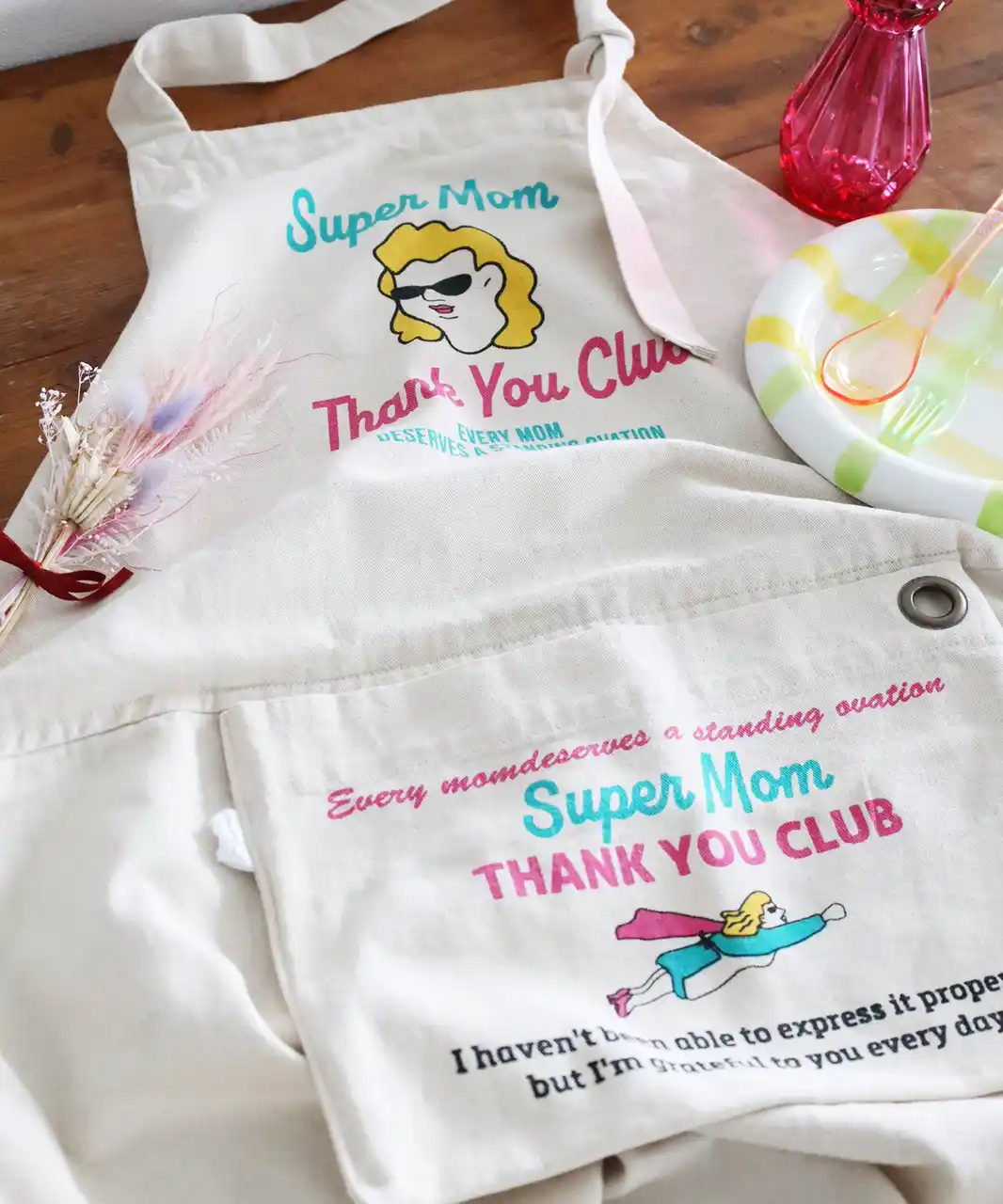 アイテムは、Super Momというオリジナルキャラクターを用いた、くすっと笑えるエプロンやポーチ、トートなどをラインアップ。また、ハンカチはいつも休みなく働くお母さんたちのお給料(!?)風の札束をデザインにしたユニークさがあふれるアイテムになっています。さらに、ビーズフラワーやデザインミラーなど、さまざまなシーンに寄り添うギフトを用意しました。特別にギフト探しをする人だけではなく、日常の買い物の中で、ふと「大切な人に贈りたい」と思えるようなアイテムとスタイルを提案します。 |