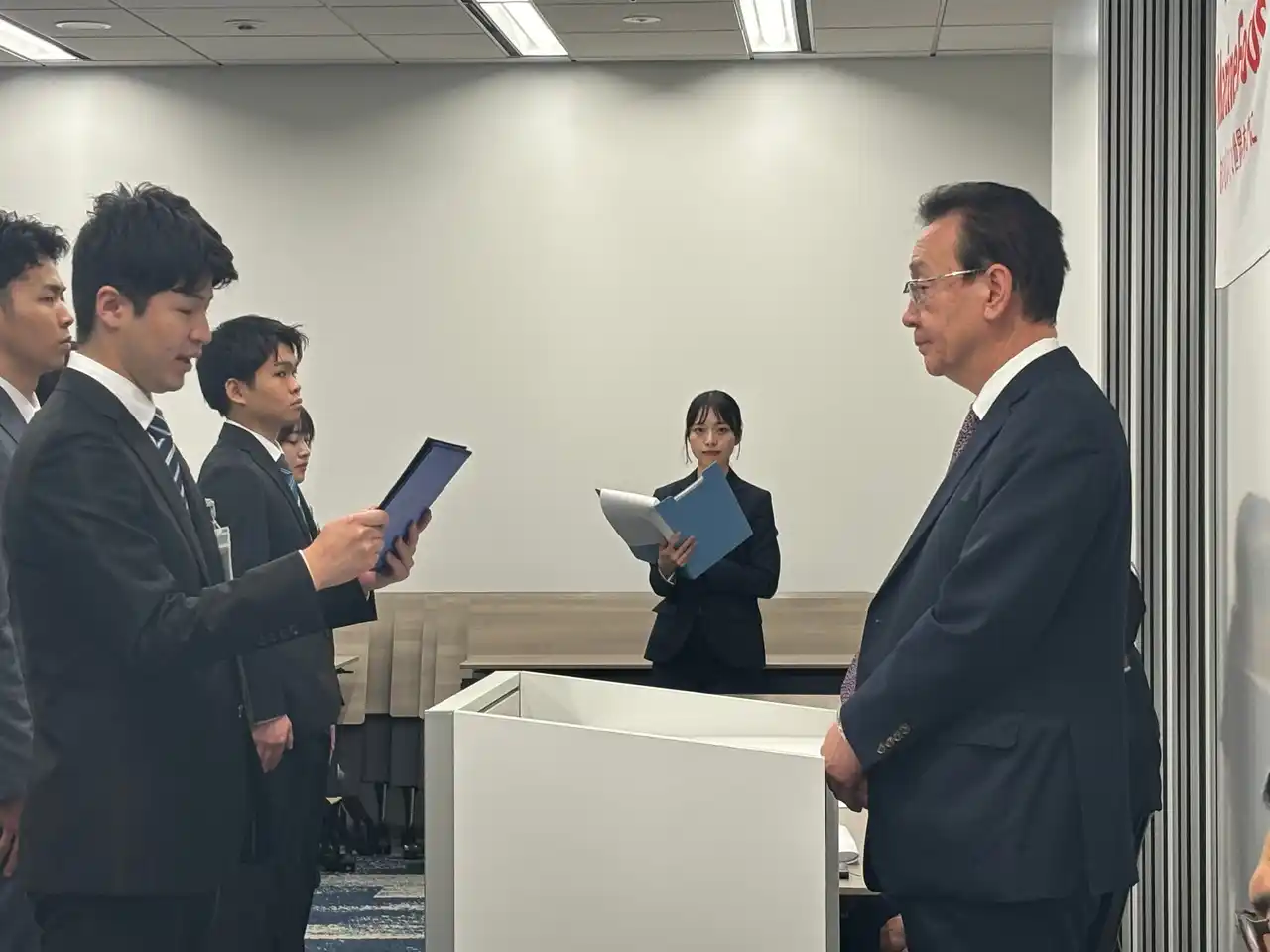 マリンフーズ株式会社(以下「マリンフーズ」)は、2026年4月1日(水)にグループ合同入社式、4月1日(水)~4月3日(金)までの3日間、東京にて新入社員研修を実施しました。本年度は、全国から集まった意欲あふれる新卒社員30名(男性22名、女性8名)を迎え、更なる成長と発展に向けた新たな一歩を踏み出しました。今回の入社式は、できるだけ多くの社員がいる場所で行いたいという社長の思いから本社で実施され、新入社員全員が入社にあたっての決意を述べた後、社長から新入社員への歓迎の言葉とともに激励のメッセージが贈られました。 |