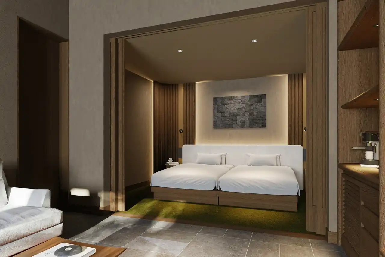 | 全12室のスイートには、プライベートサウナと森へとつづくテラスを備え、窓いっぱいに広がるカラマツの森が目に映ります。柔らかな陽射しや木漏れ日、そよぐ風が室内に静かに流れ込み、建物の輪郭は森に溶け込むよう。足を踏み入れた瞬間から、五感がゆるやかに整い、身体と心が本来の感覚へと還っていく体験が始まります。 | |||||||||