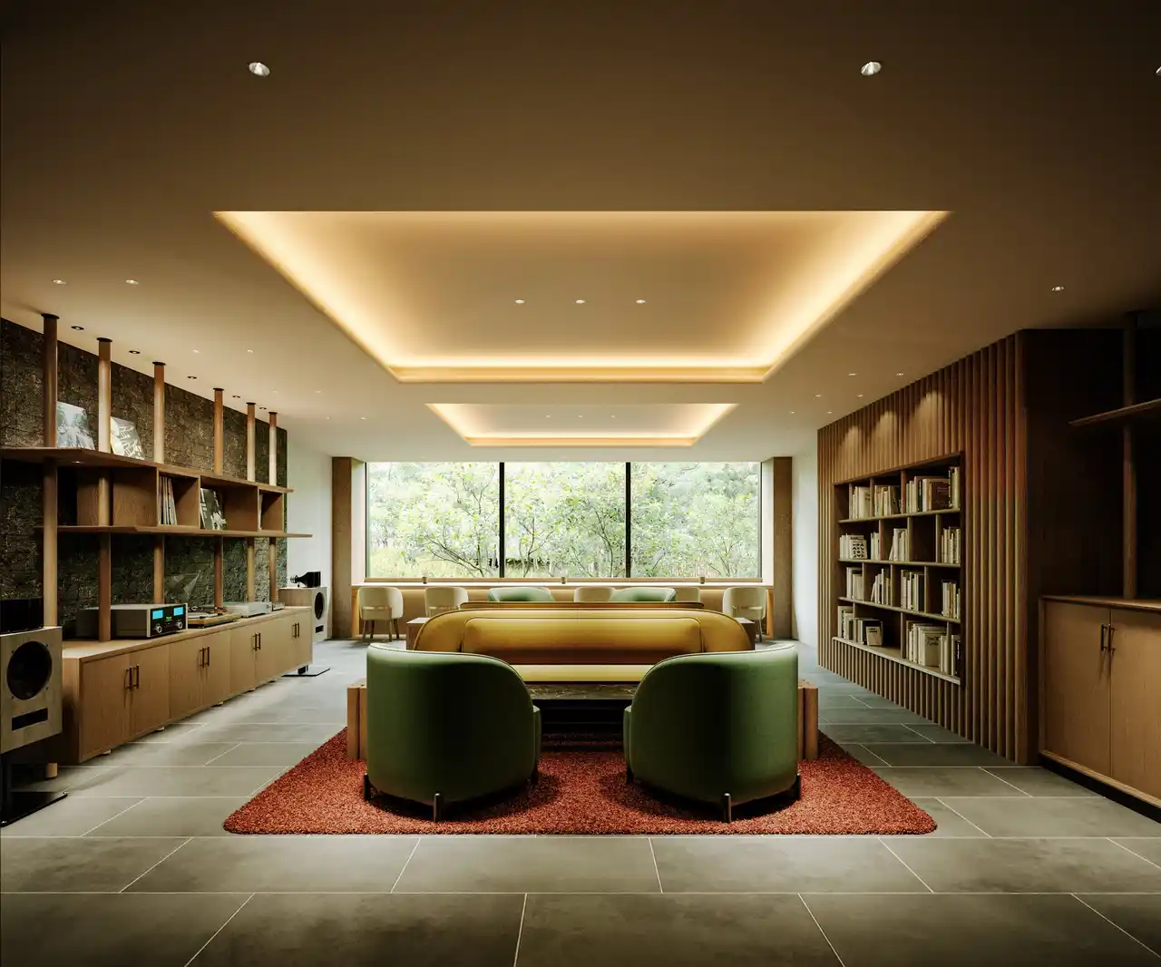 | 室内は軽井沢の四季を映す色彩と自然素材で構成されています。春の若草色、夏の深緑、秋の黄金色、冬の淡い白をカーテンや椅子、家具にそっと忍ばせ、浅間山の浅間石やカラマツの丸太を取り入れることで、森の立体感とリズムを室内に呼び込みます。光と影の移ろいが生むやわらかなリズムは、どこにいても自然の延長のような体験をもたらします。 | |||||||||