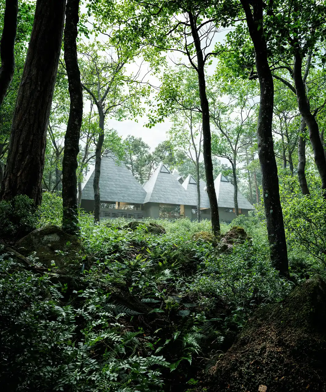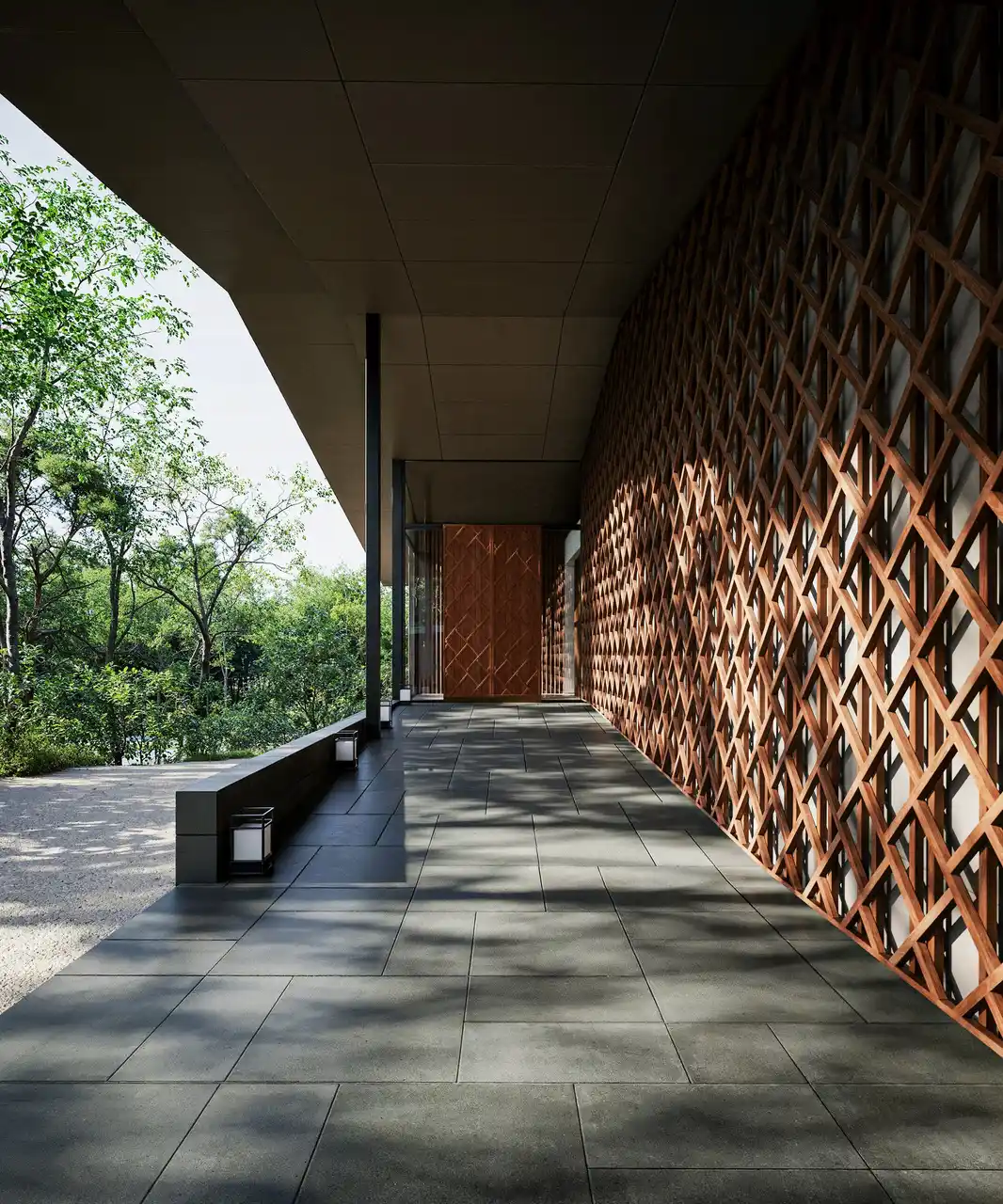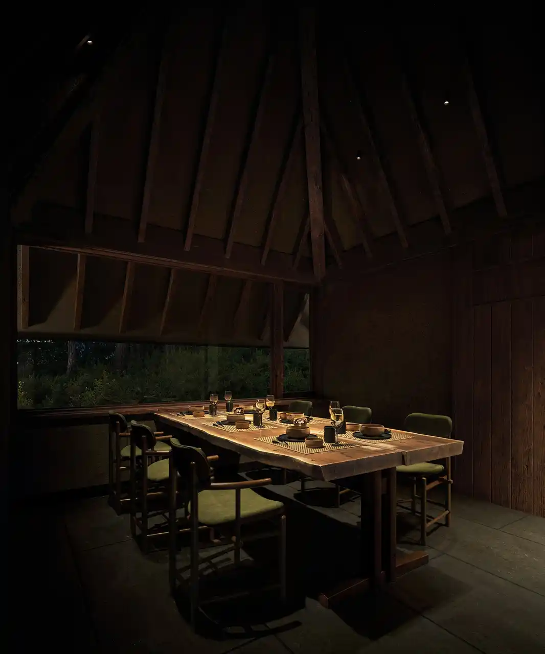 | 建築の空間には、日本文化に息づく「真・行・草」の思想が重なります。都市の緊張を帯びた「真」では、車寄せの低い軒や縦格子が都市的な感覚を残しながら迎えます。心身がほどける「行」では、回廊や客室棟に差し込む木漏れ日や影が、歩く身体にそっと触れて落ち着きをもたらします。そして森の空気と完全に響き合う「草」では、テラスやアウトドアダイニング、森の香りや光、屋根の連なりが視界に広がり、身体も心も森とひとつになる体験へと誘います。 | |||||||||