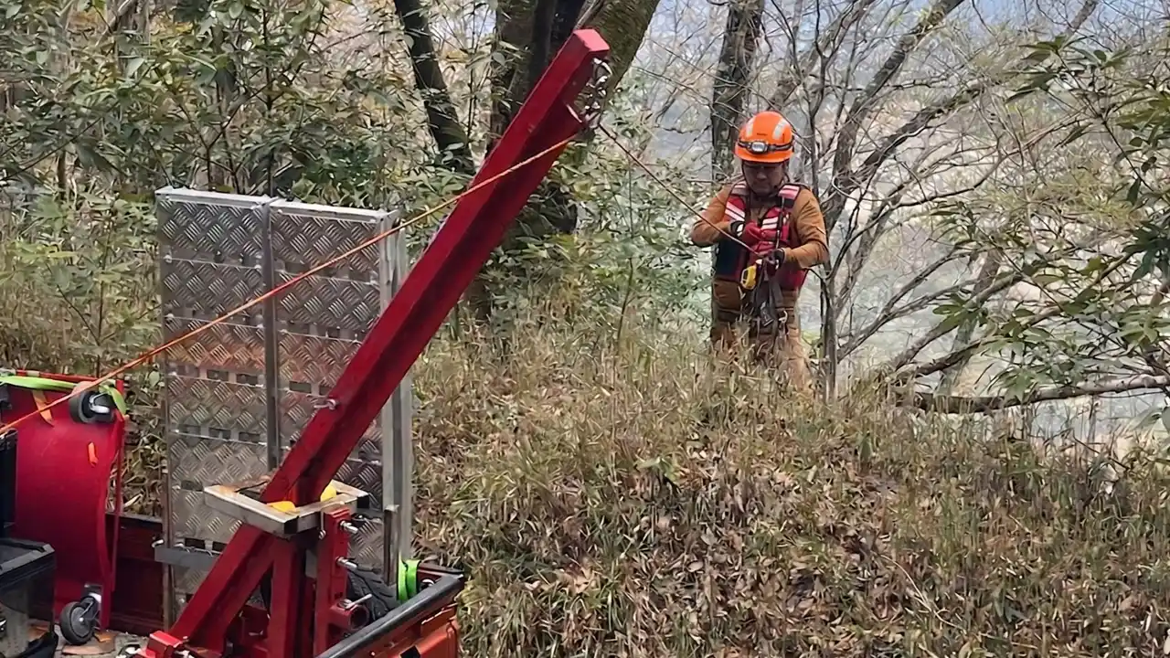林道より専用車両で転落したバイクの引き上げ ウインチをセット |