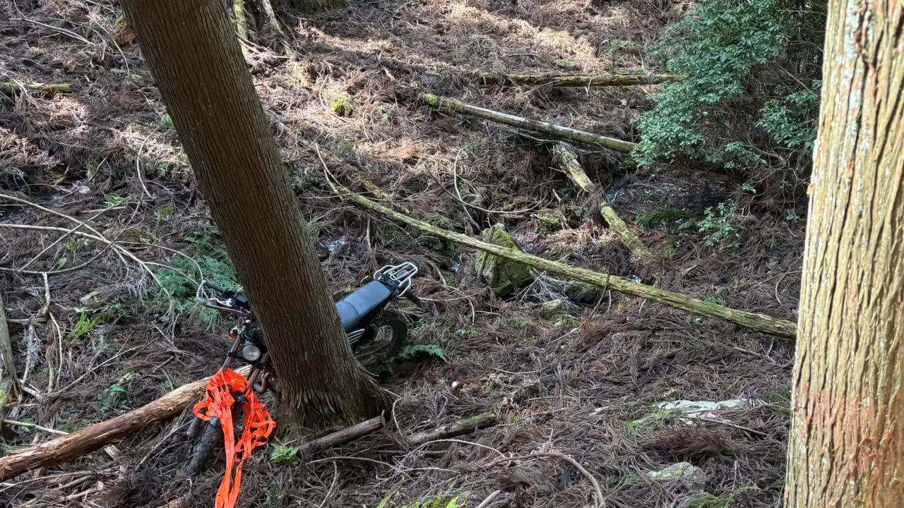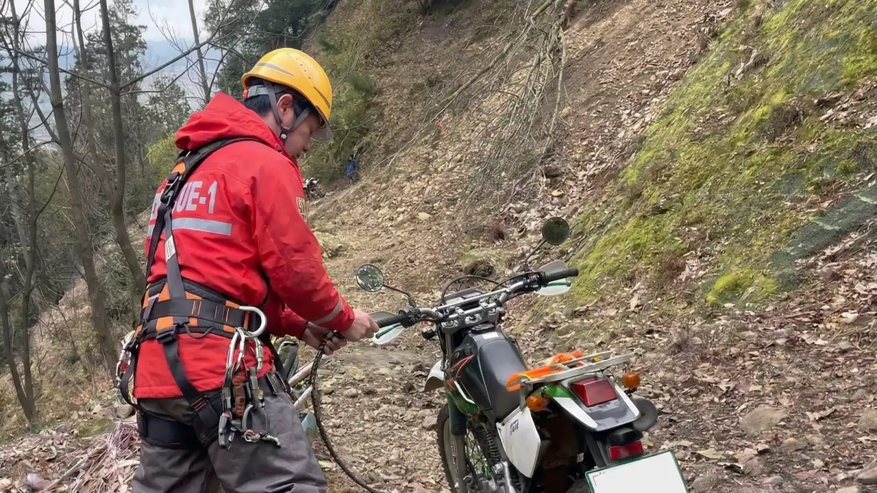 登山で約30分 大規模な土砂くずれで崖ギリギリをロープでバイクを渡す |
