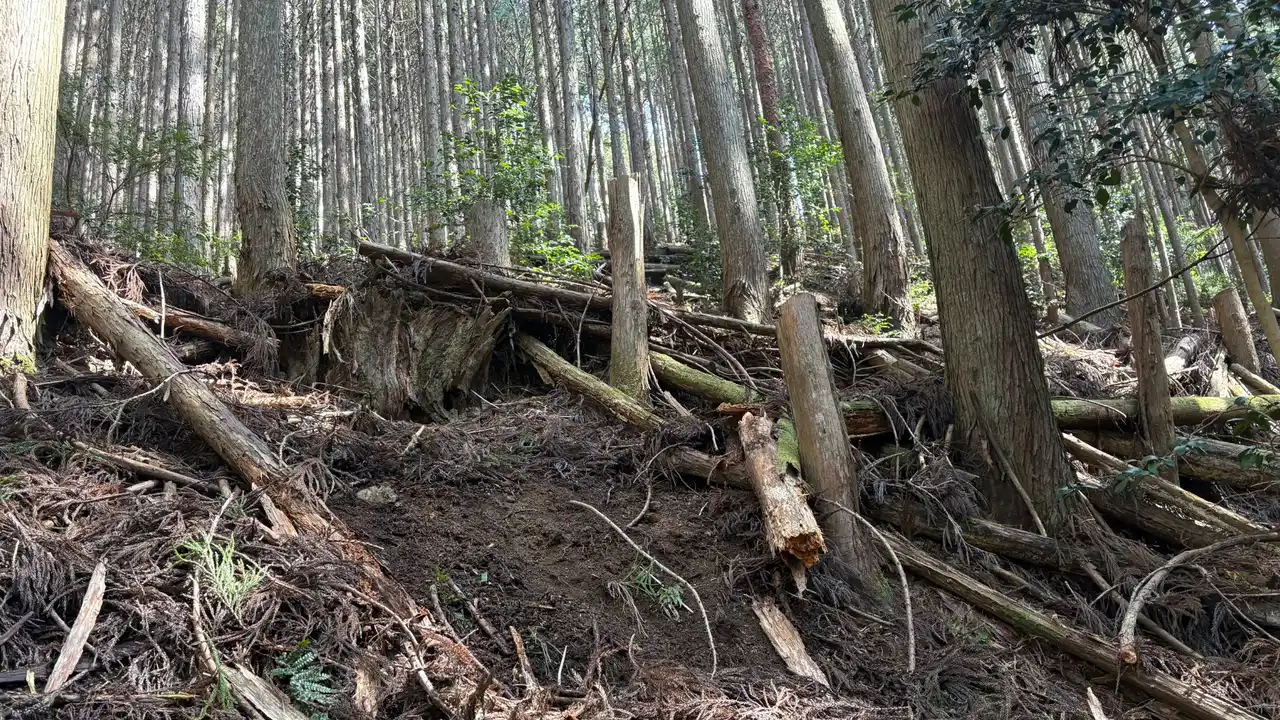 入山から徒歩30分ほどの林道より 斜度40度 15mの転落現場 斜面に障害物が多い |