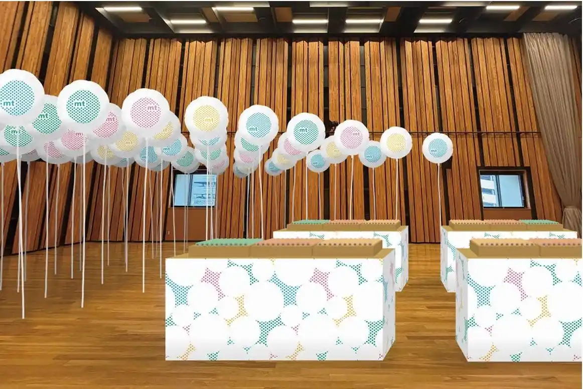浮遊感のあるmtオリジナルデザインの風船を使ったインスタレーション装飾は、天井高のある会場の空間がよりゆったりと感じられ、初のmt ex展を記念するお祝いムードを華やかに盛り上げます。 |