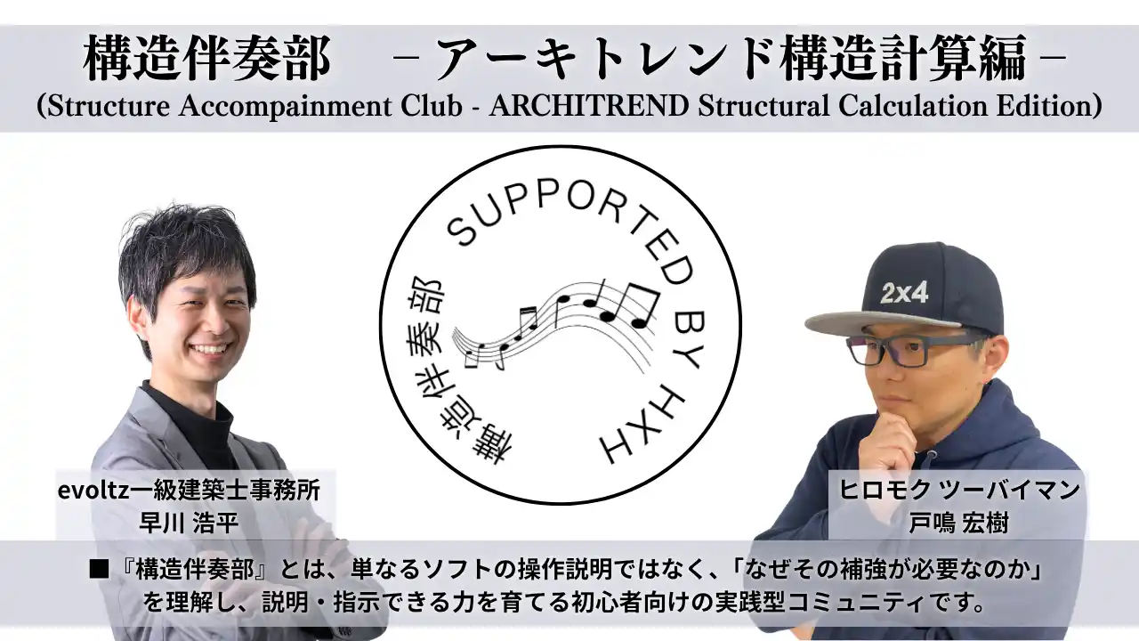 evoltz一級建築士事務所(管理建築士:早川浩平)と構造設計事務所のヒロモク(代表:戸鳴宏樹)は、木造住宅の構造計算に携わる設計者を対象とした、日本初のオンライン実践型コミュニティ**『構造伴奏部 ーアーキトレンド構造計算編ー』**を2026年4月より開始いたします。 |