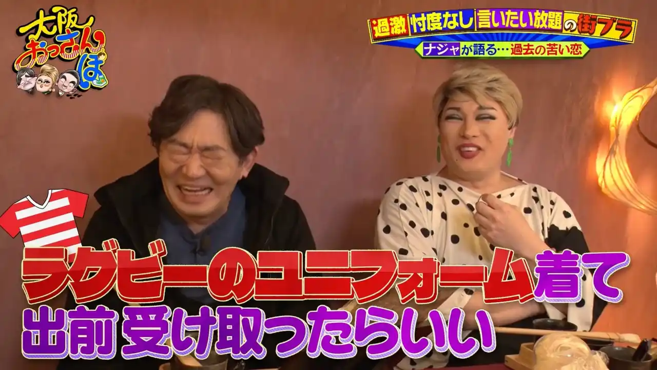 会話の流れから恋愛トークに。52年間恋人がいないナジャ。ある日、出前を届けに来た男性がかなり好みのタイプだったそう。ナジャいわく、ゲイ同士には「お仲間かも」と感じ取る感覚があるそうで、その男性にも可能性を感じたという。それを確かめるために、ゲイに人気のあるラグビーのユニフォーム姿で出前を受け取ったというが……。まさかの結末に黒田と橋下は大笑い! |