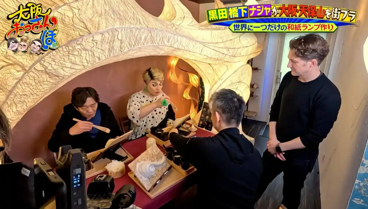 「お菓子ミュージアム天保山」を後にし、港商店街を散策。昭和レトロな町並みの中で見つけたおしゃれな店「JeBon」に立ち寄る。ここで和紙ランプを作る体験ができると聞いて、さっそく挑戦。この店は国際結婚したご夫婦が営んでいて、夫婦の運命的な馴れ初めに耳を傾けながらランプ作りを楽しむ。 |