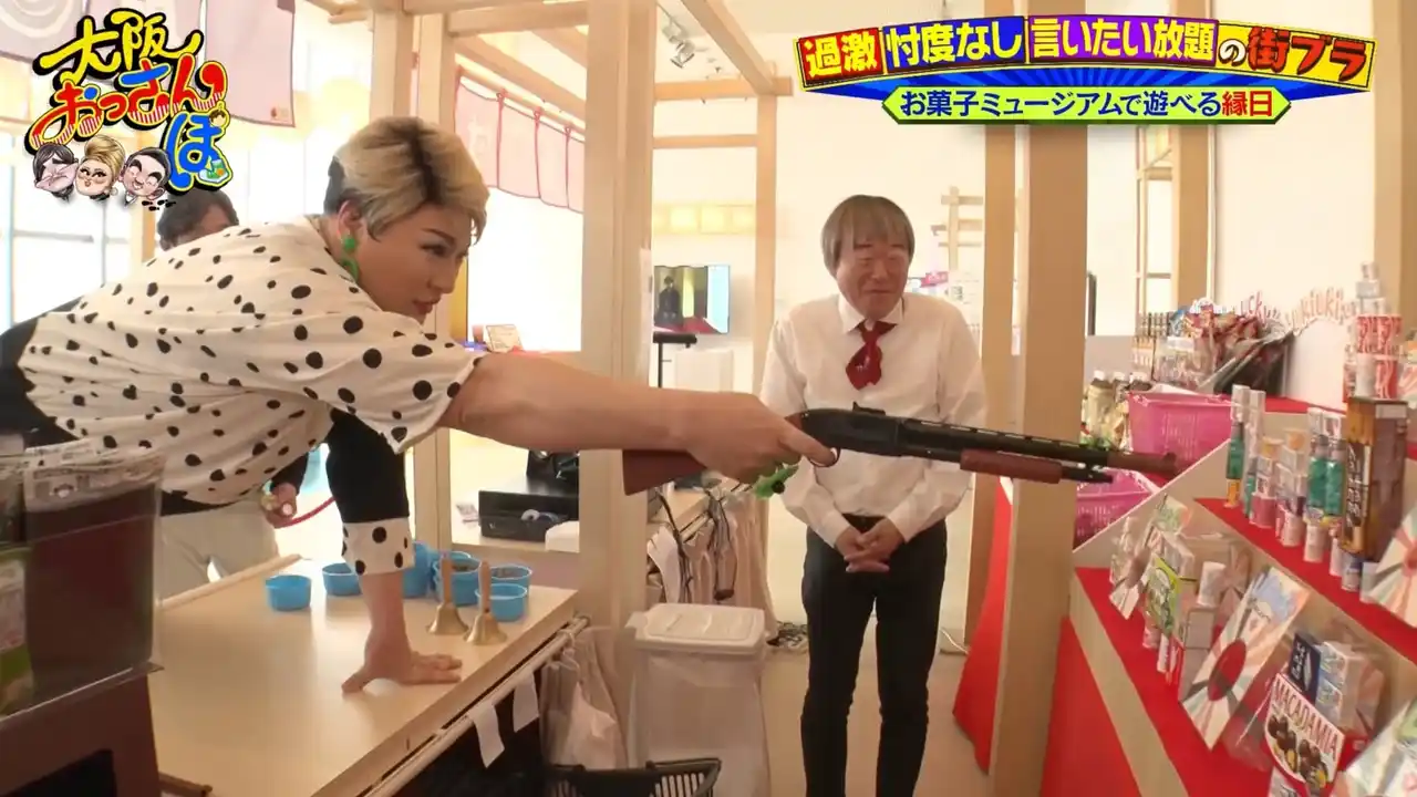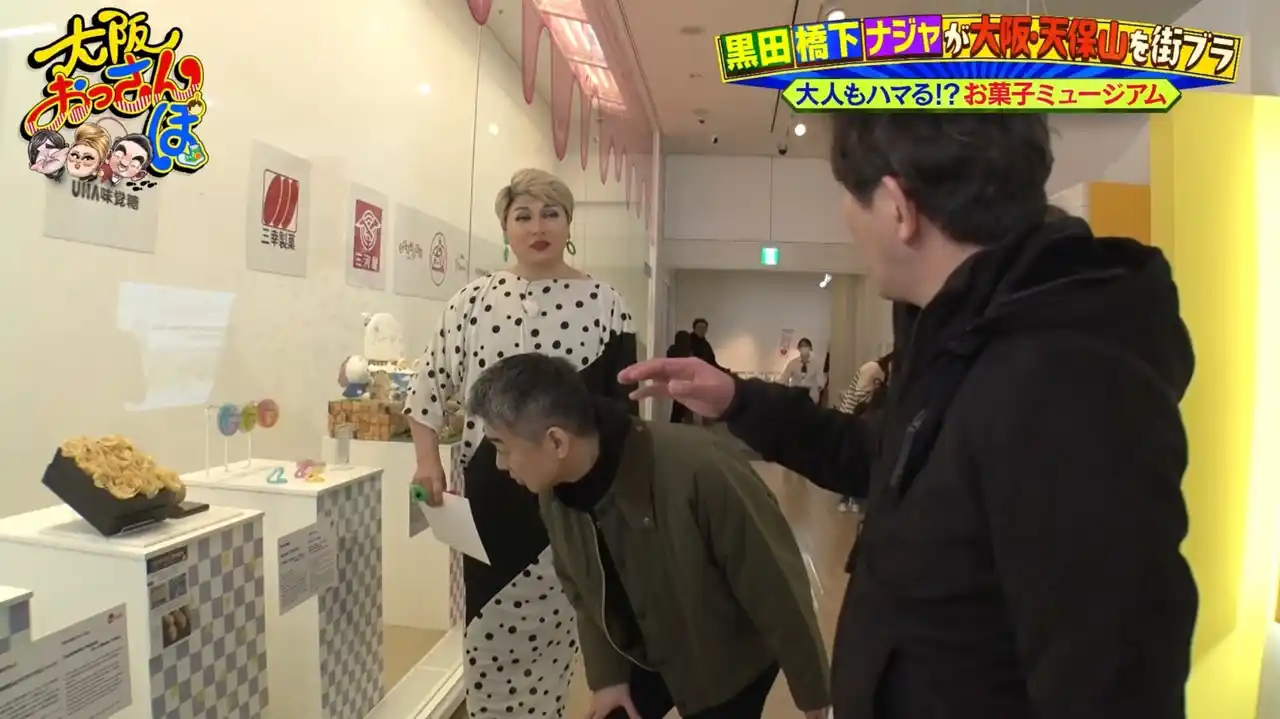 まずは「お菓子が大好物」というナジャにぴったりの新スポット「お菓子ミュージアム天保山」へ。ユニークな社長に案内されて、館内を巡るおっさんたち。懐かしい駄菓子や未来のお菓子を見学して大興奮! |