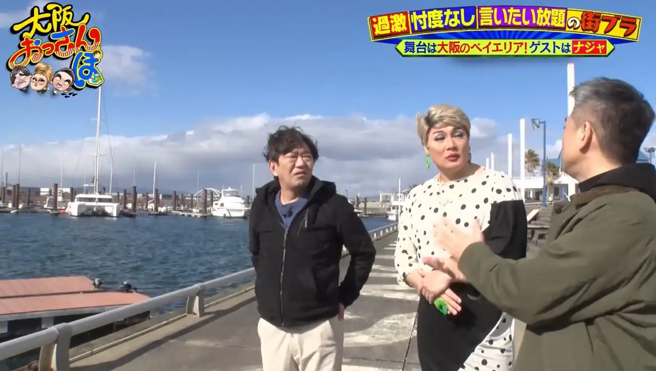 ロケは、大阪北港マリーナのヨットハーバーからスタート。橋下がのっけからこの場所にまつわる大阪市長時代の自慢話を繰り出し、黒田は「海に落としたいな……」とボソリ。続けてナジャに「ごめんな、言いたがるねん」と謝るとナジャは「慣れてますから」と涼しい顔。 |