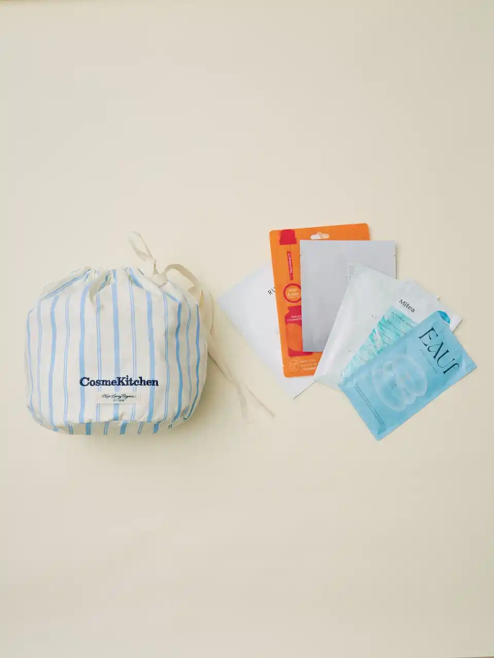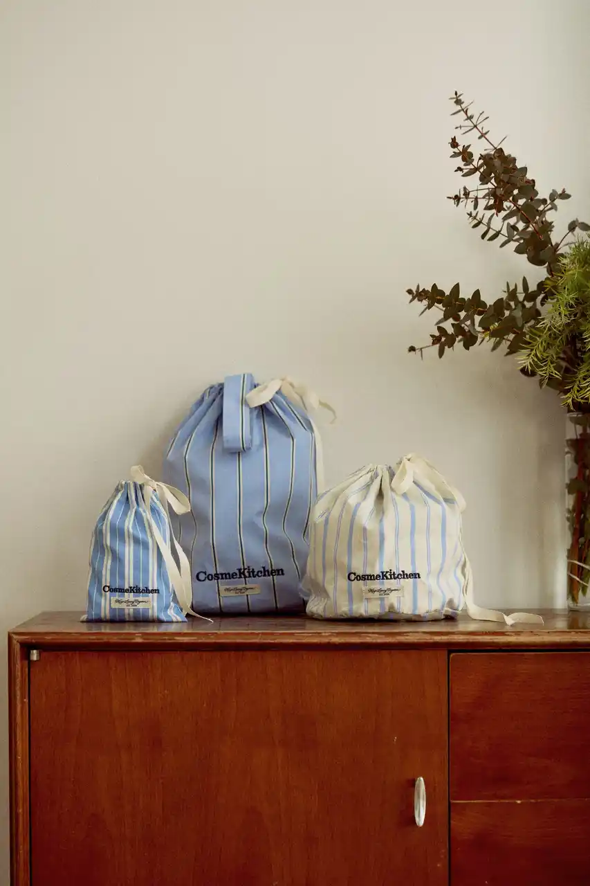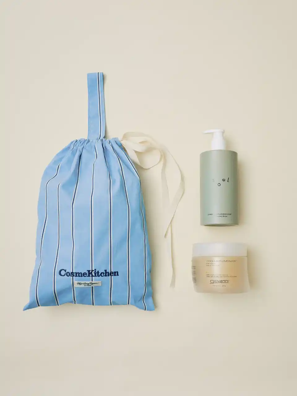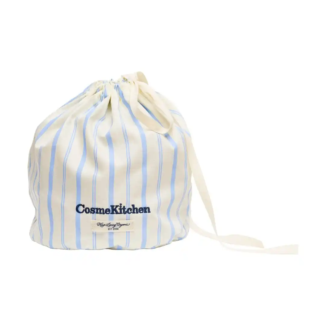 巾着には、スタンダードで長く愛されているストライプ柄を採用。ブルートーンのCosme Kitchenオリジナル“コスキチストライプ”をあしらい、自分用としてはもちろん、贈り物を大切に包みながら、もらった後も使い続けられるような、日常の溶け込むデザインに仕上げました。 |