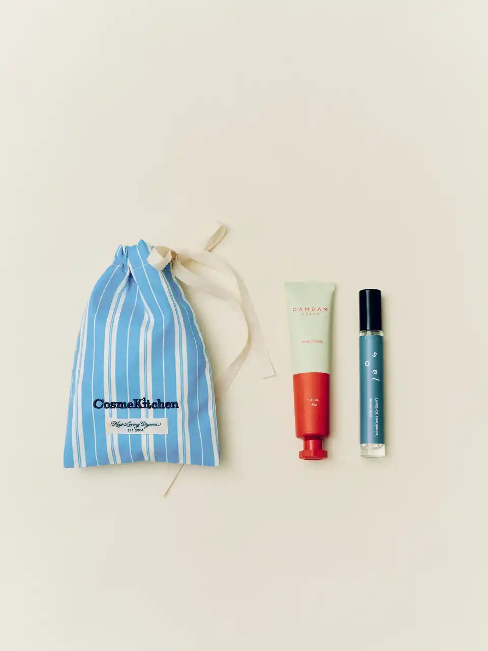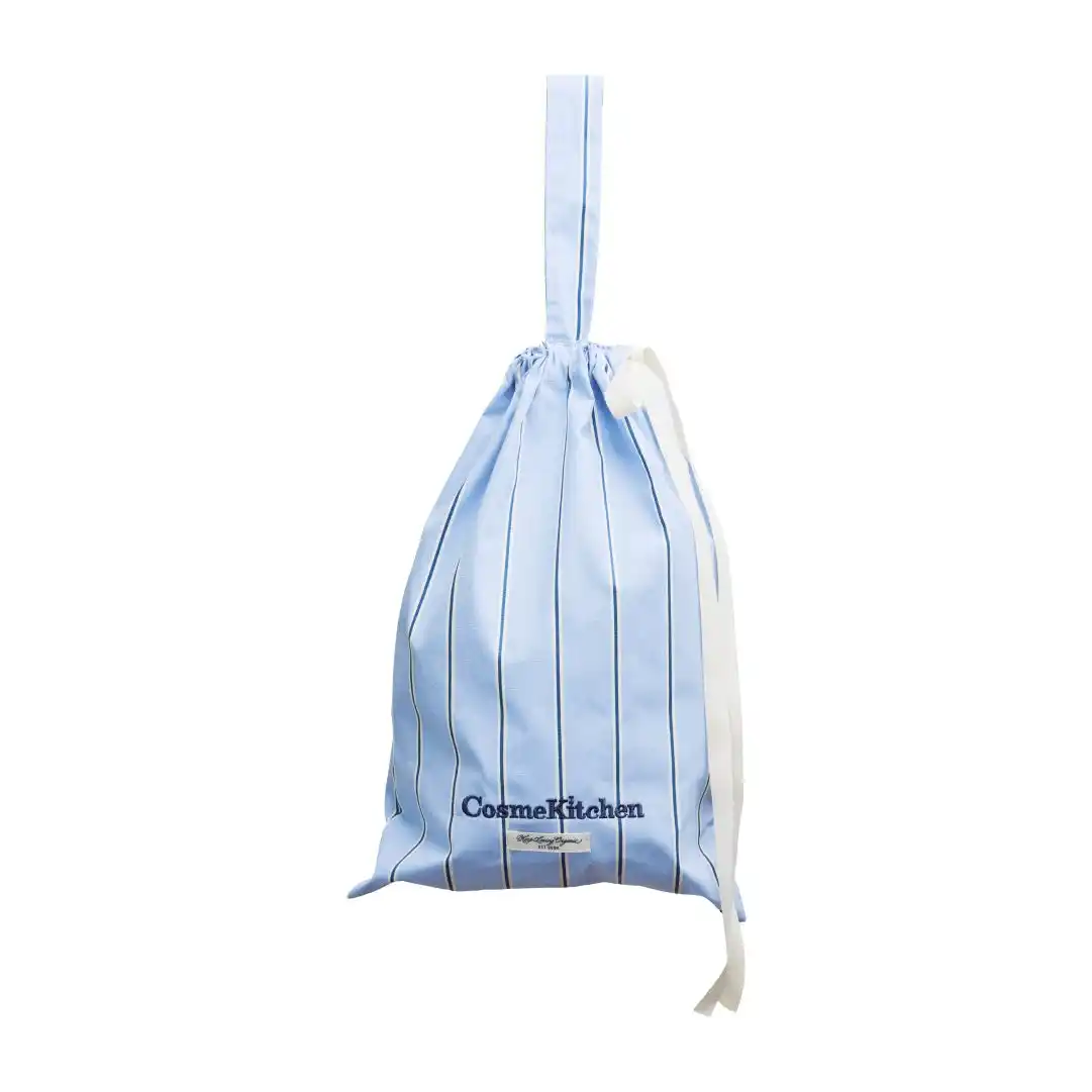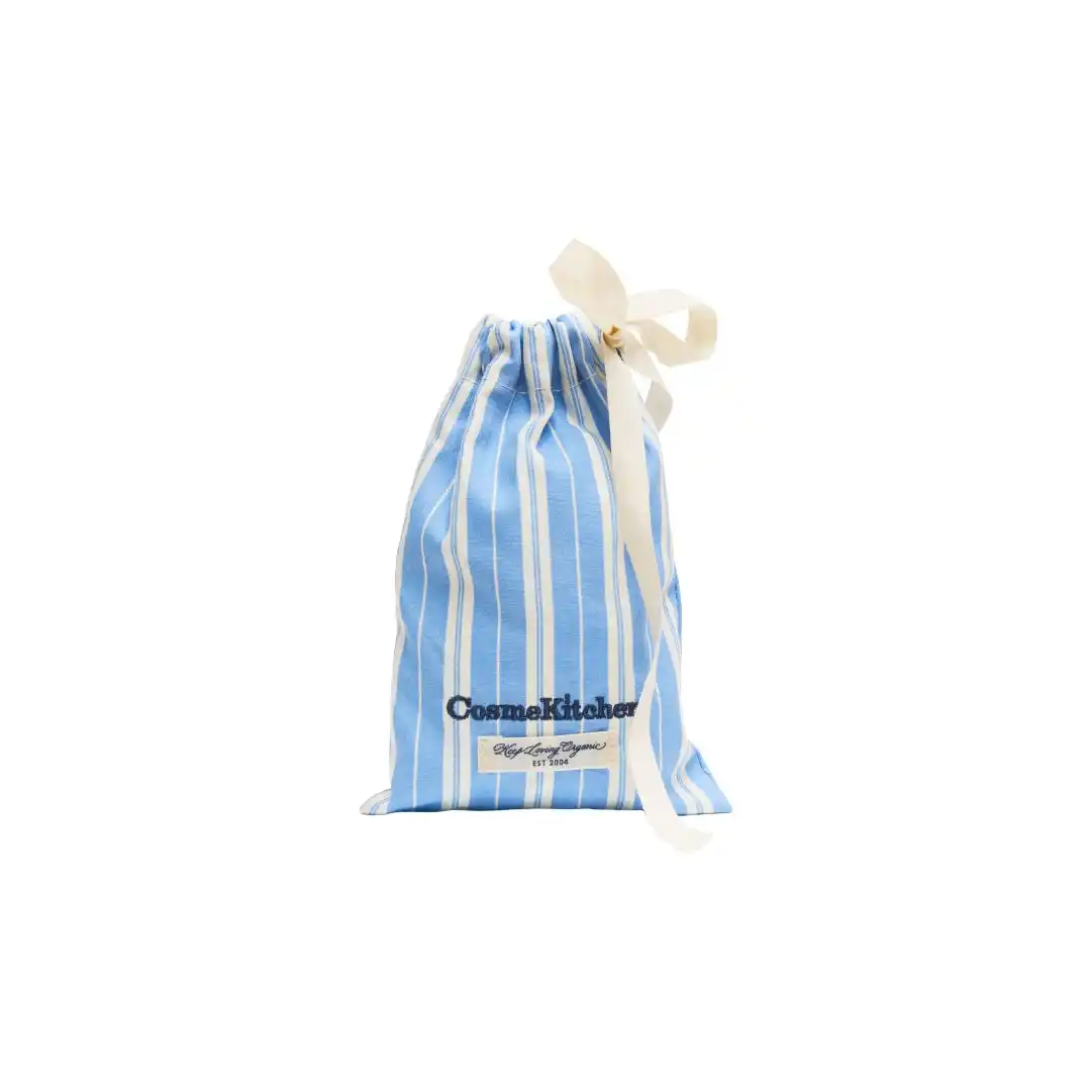 巾着には、スタンダードで長く愛されているストライプ柄を採用。ブルートーンのCosme Kitchenオリジナル“コスキチストライプ”をあしらい、自分用としてはもちろん、贈り物を大切に包みながら、もらった後も使い続けられるような、日常の溶け込むデザインに仕上げました。 |