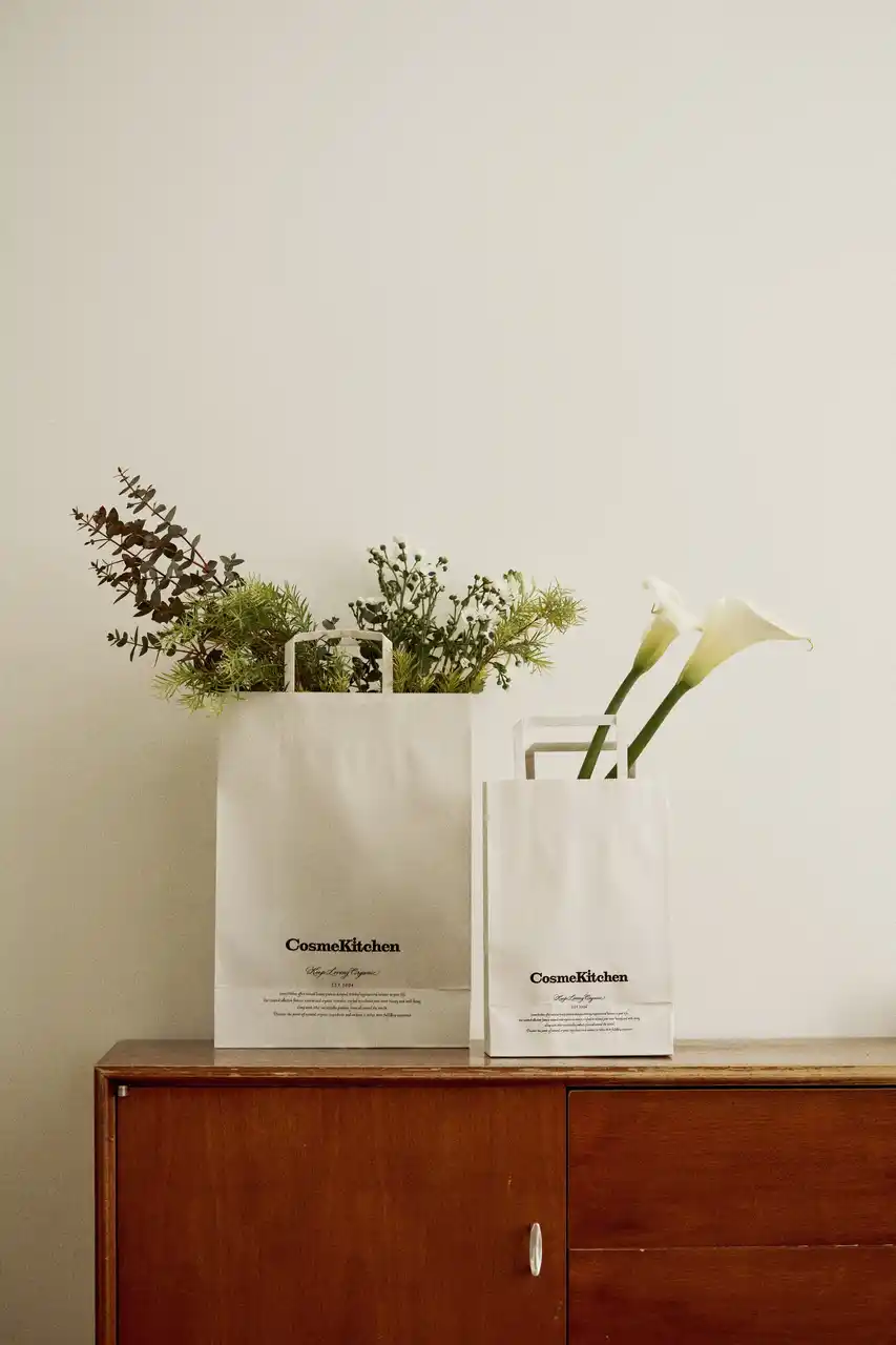 「環境にも、手に渡る人にも優しくありたい」、そんな想いを込めてショッピングバッグのクラフト紙はFSC認証・古紙70%の素材、インクにはボタニカルインキを使用いたしました。 |