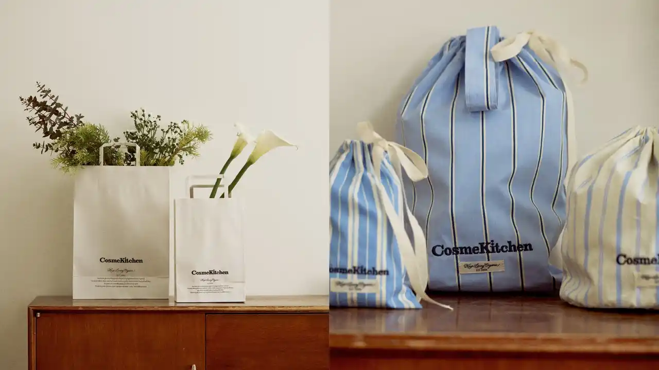 コスメキッチンで販売しているショッピングバッグ、巾着が新たなデザインとなり、登場。 |