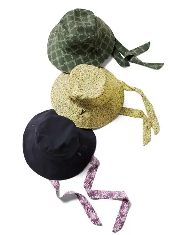無地と柄で印象を変えられるリバーシブル仕様。ワイヤー入りのつばや、風対策にもなる共布リボンが便利です。 |