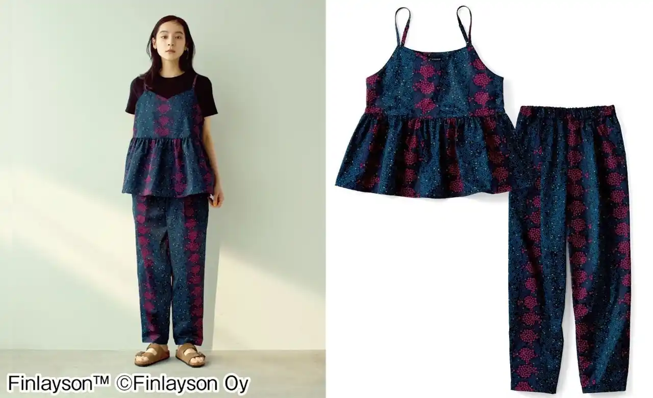 フィンレイソンの人気柄である赤いベリーが印象的な〈フィンレイソンマルッタ〉パターンをプリントした、キャミソールとテーパードパンツのセットアップです。縦ラインを強調した柄行きで、甘すぎない大人っぽい華やぎを演出します。夏はキャミソールや半袖と合わせて、冬はタートルネックと重ねてなど、それぞれ単体でもコーデの主役としてオールシーズン着まわせます。パンツはウエスト総ゴム仕様でらくちん、季節を問わず長く着られるほどよい厚みと張り感のある素材を使用しています。 |