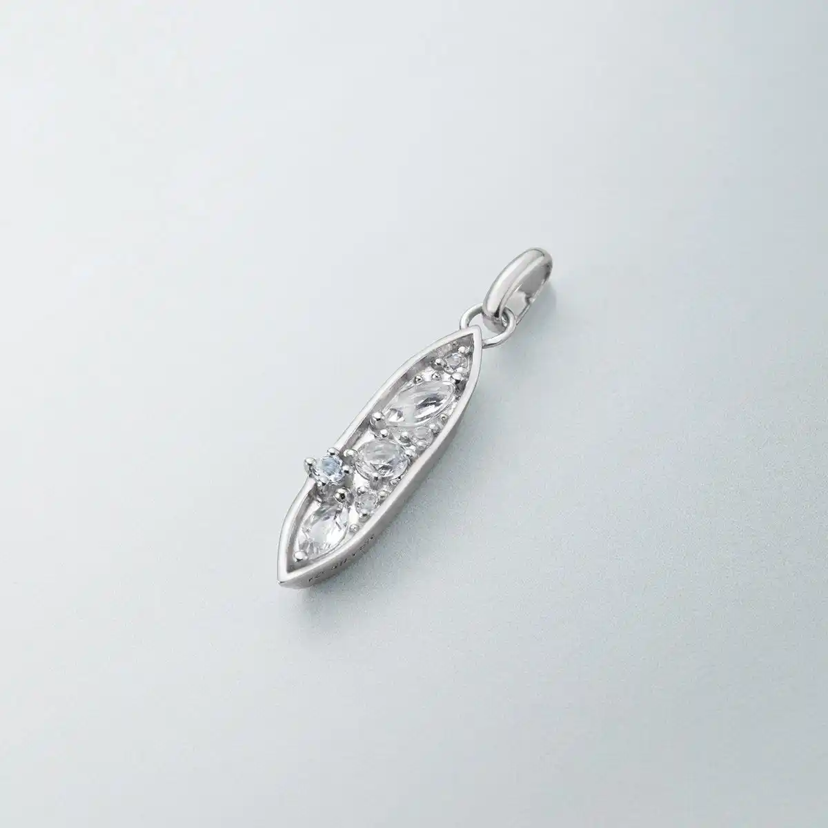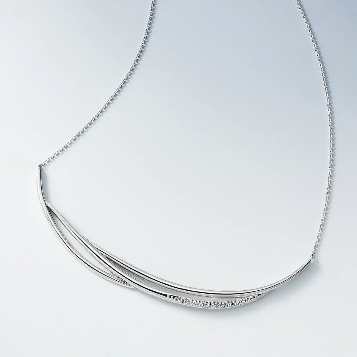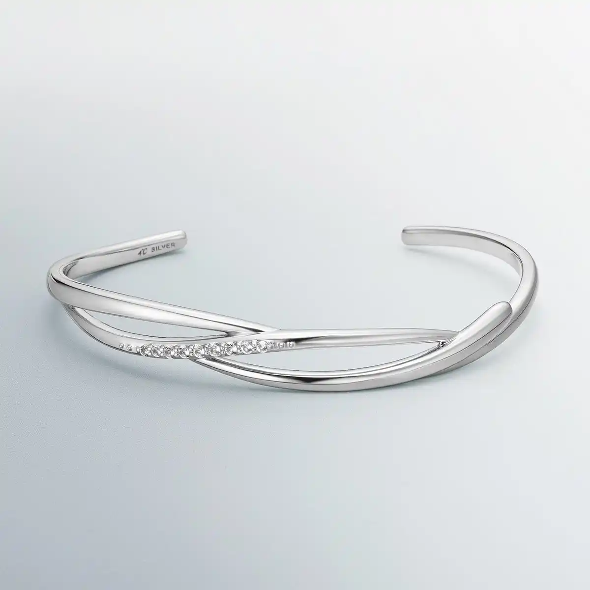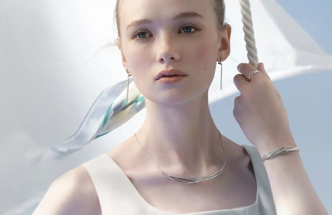 帆を張って進む船に吹き抜ける爽やかな風や、水面のきらめきをイメージしたボリューム感のあるシルバージュエリー。帆船が「順風満帆」や「困難を乗り越える」という意味を持つように、人生の飛躍を願う想いを込めたシリーズです。風の流れを思わせる立体的なラインで、軽やかな動きを表現しました。ネックレスは、ラインに沿ってセッティングされたトパーズが光を受けて繊細に輝き、水面のきらめきを思わせる透明感を添えます。さらに、2種類のチェーンを組み合わせたネックレスは、チャームを取り外して楽しめる2WAY仕様。装いに合わせてアレンジできるデザインです。リングやバングルは、流れるようなフォルムが手元に自然になじみ、シルバーならではの存在感を引き立てます。 |