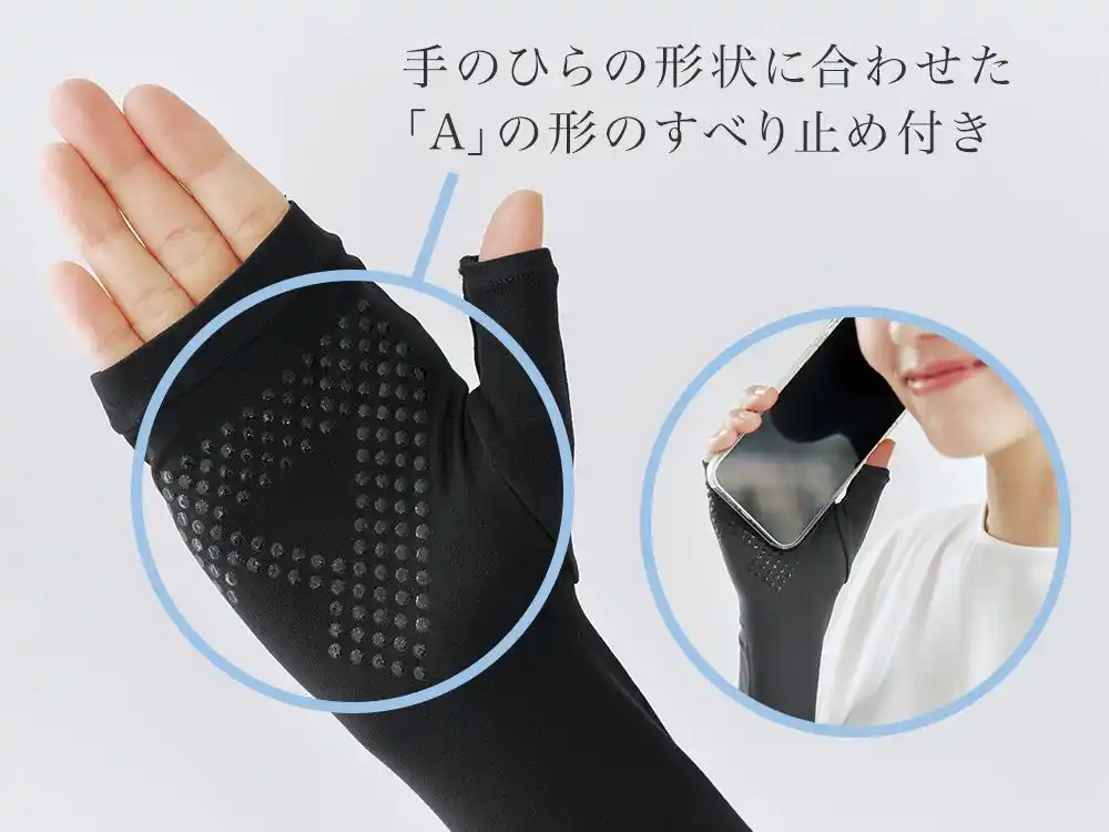 アームカバーを付けていてもスマートフォンや自転車のハンドルが滑らないよう、手のひらの形状に合わせた「A」の形のすべり止めを付けています。 |