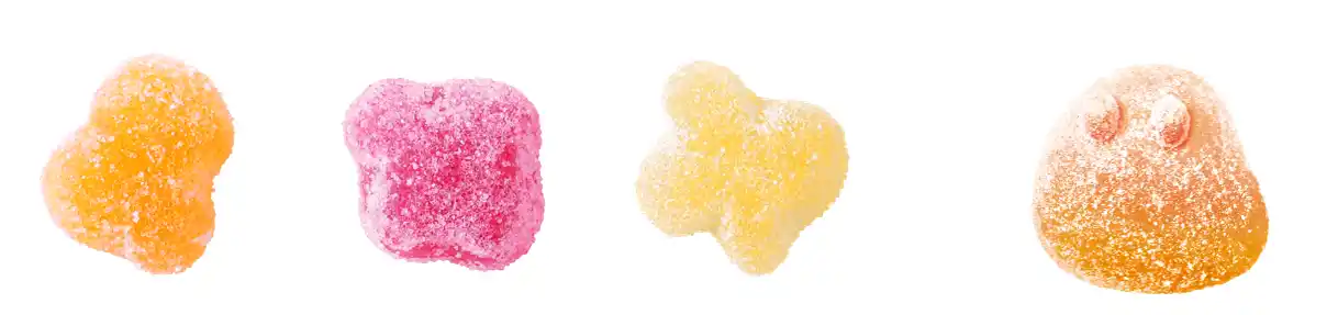 グミ粒は従来と同様、高低差のあるいびつでゆるい癒し系の形で、噛む場所によって異なる食感をお楽しみいただけます。レア型として、「むにょむにょくん」が入っているかも。 |