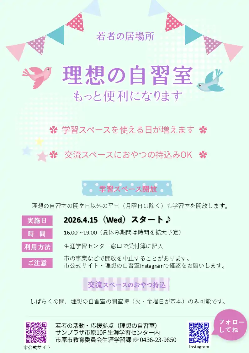 千葉県市原市では、高校生・大学生からいただいた「こんな居場所がほしい」というアイデアを形にし、2024年6月に若者の活動・応援拠点「理想の自習室」をオープンしました。 |