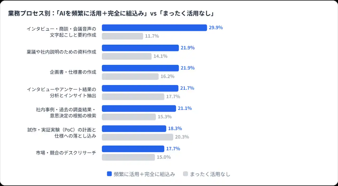 業務プロセス別にみたAI活用状況では、文字起こし・要約が最も浸透しており、約3割が本格活用しています。一方、PoC計画・仕様化やインサイト分析など判断を要する上流工程は限定的で、浸透の遅れがみられます。 |