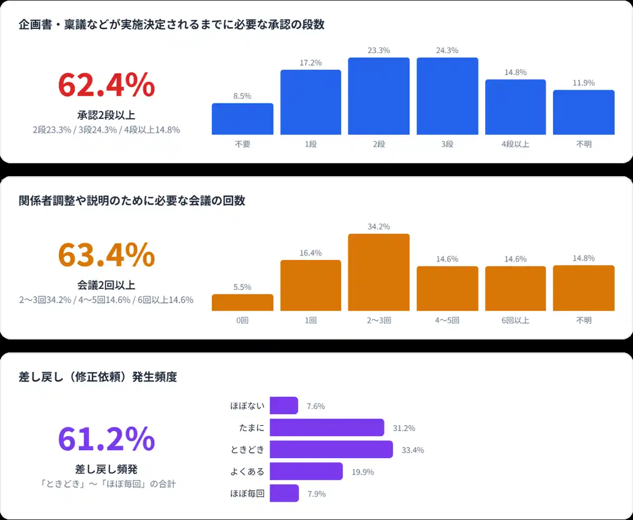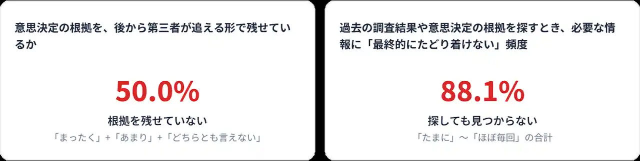 「承認が2段以上必要」「会議が2回以上行われる」「差し戻し常態化している」がいずれも6割超。約9割が過去の意思決定根拠を探しても見つからなかった経験があることが明らかに。 |