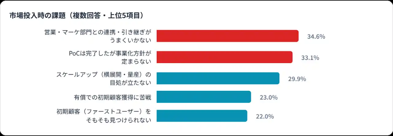 最大のボトルネックは「営業・マーケ部門との連携・引き継ぎがうまくいかない」(34.6%)と「PoCは完了したが事業化方針が定まらない」(33.1%)で、いずれも社内の組織間連携に関する課題が上位を占めた。 |