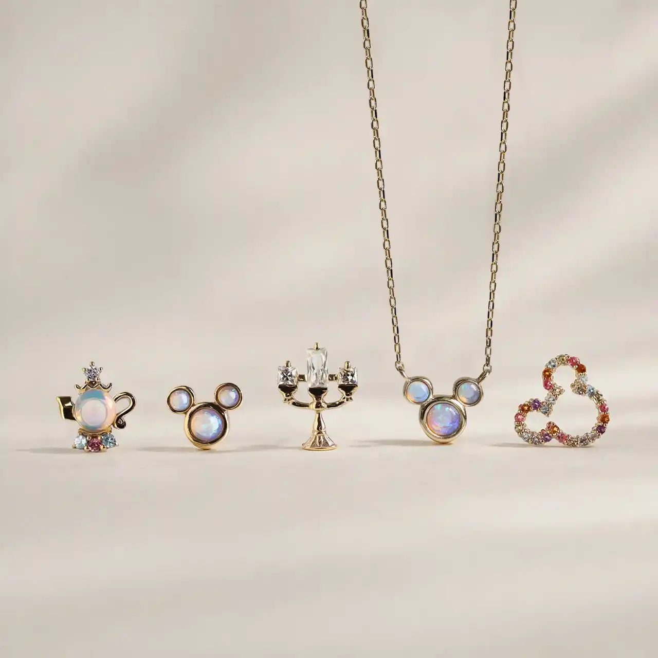 オパールを使用したミッキーモチーフの他、『美女と野獣』のルミエールやポット夫人、『白雪姫』のリンゴなど、物語の世界観を繊細なK10ジュエリーで表現。 |