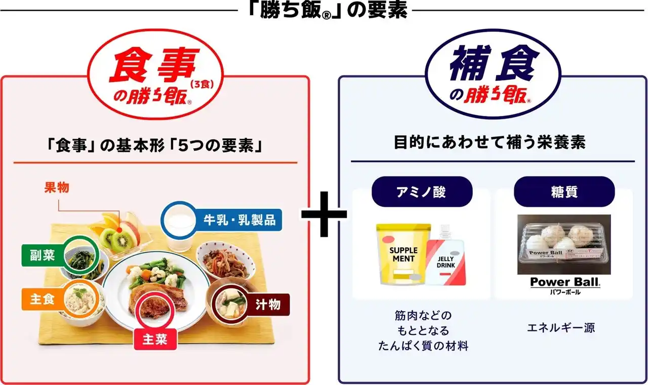 勝ち飯(R)はトップアスリートのサポート活動から誕生した“なりたい自分”を実現するための栄養プログラムです。3度の食事+補食で構成され、スポーツ栄養学に基づくメニューで、アスリートのコンディショニングをサポートしています。また、アスリートと同じように目標に向かってがんばる人の健康なカラダづくりを応援しています |