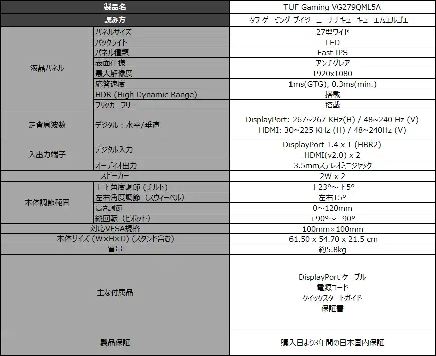 ASUS JAPAN株式会社は、TUF Gaming シリーズ第5世代モニターの最新モデル「TUF Gaming VG279QML5A」を、2026年4月10日(金)に全国の家電量販店やオンラインストアにて発売開始します。ゲーマーのみならず、FPS/eスポーツ志向の高度な環境から、デスクスペースや予算を抑えた導入をご検討の方々まで、多様なユーザーのニーズに対応した仕様となっています。競争力のある価格帯で提供される本モデルは、最新のGaming AI機能を搭載し、ゲーム体験を劇的に向上させるアップグレードを実現しています。 |